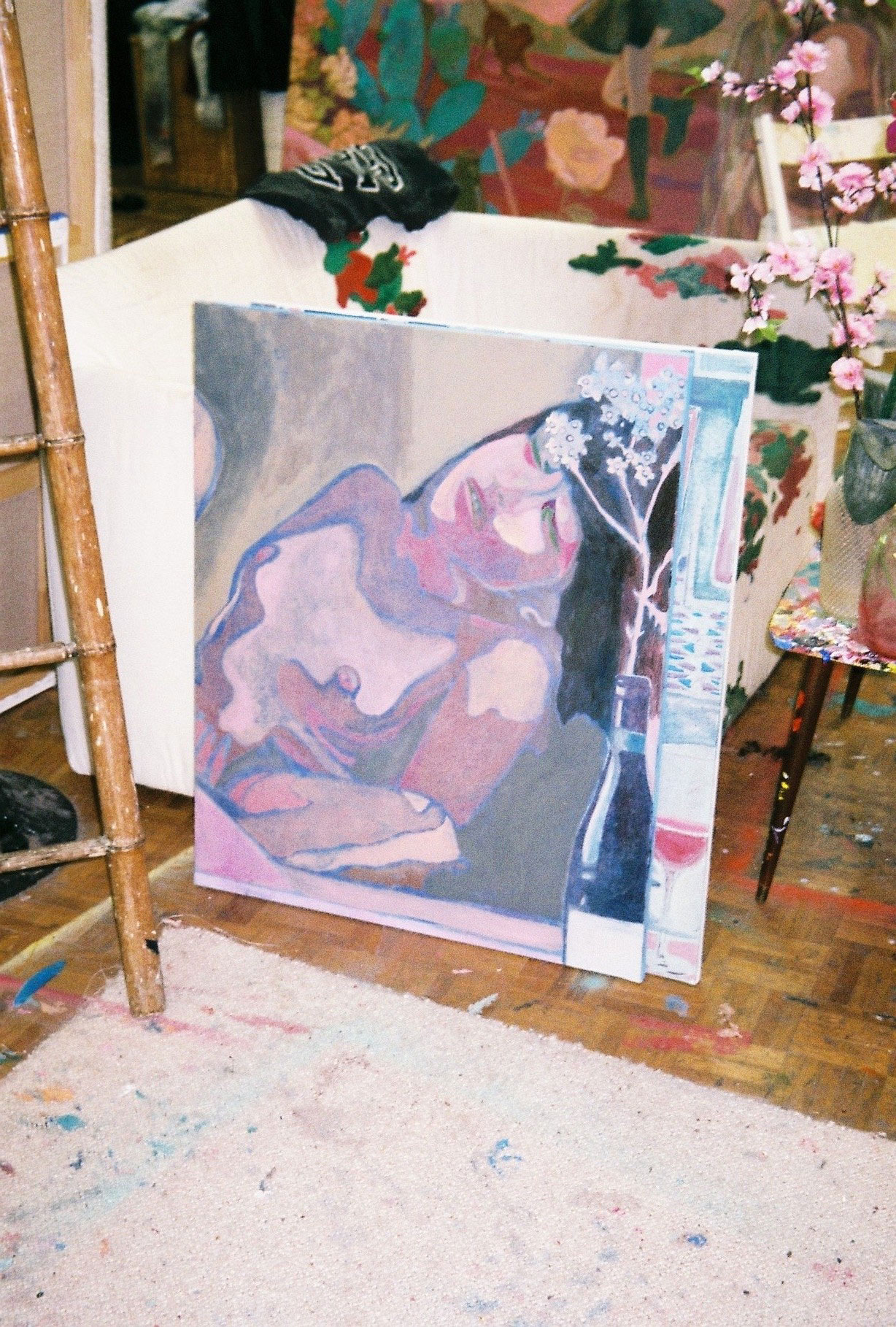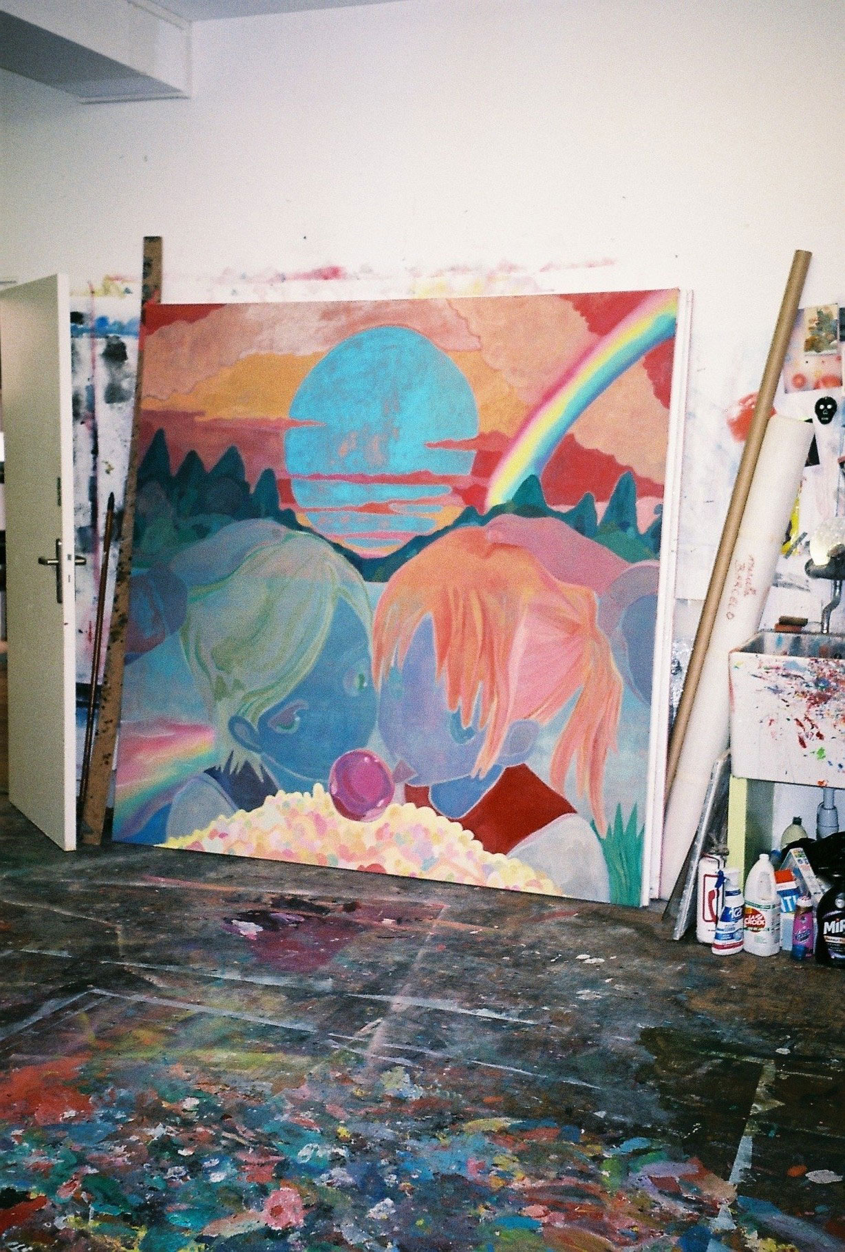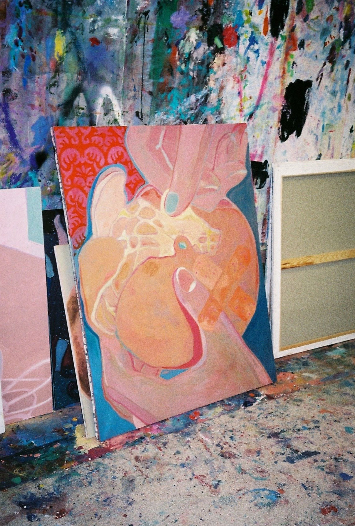 I really love solitude and it feels a condition necessary for me to draw and paint. Since the isolating obligations began in France due to COVID-19, my daily life hasn’t changed at all and I am quite happy not to have to tell friends I can’t go out! I usually spend the day reading and drawing and the evening and night painting. I like the daylight for drawing and the darkness for painting, because I sometimes use a video projector on some of the big scale paintings, that also explains the dark curtains! Also, my curtains are now open because all my neighbours left with the quarantine. One self-portrait where I am holding a hot-water bottle is for me very significant in depicting this researched loneliness. I wanted to show those opposing factors; the coldness outside and the warmth inside, the dirty dishes and the childish pink dress. I think that all my works are autobiographical in a way, with images from real life or symbols (like the unicorns or dragons) to represent a feeling. For instance, the collage-like painting of a peeled mandarin with a band aid is to illustrate a feeling where I can’t find words to describe it, the impression of something acid and sweet mixed with tactile plastic that imitates skin, it is not disgust or sadness, but a sense with no words. I use those collages to try to express these mute feelings.