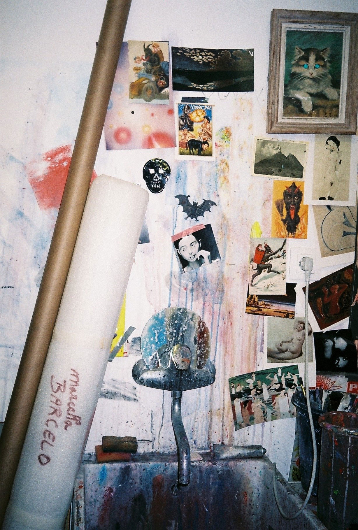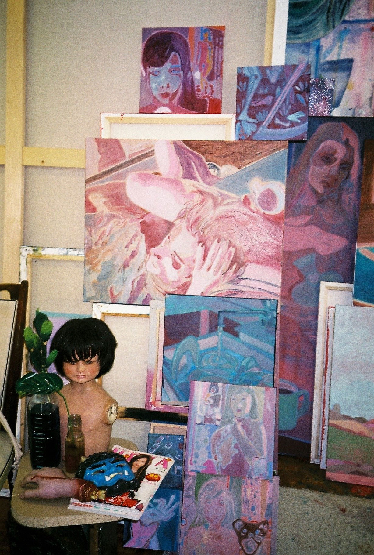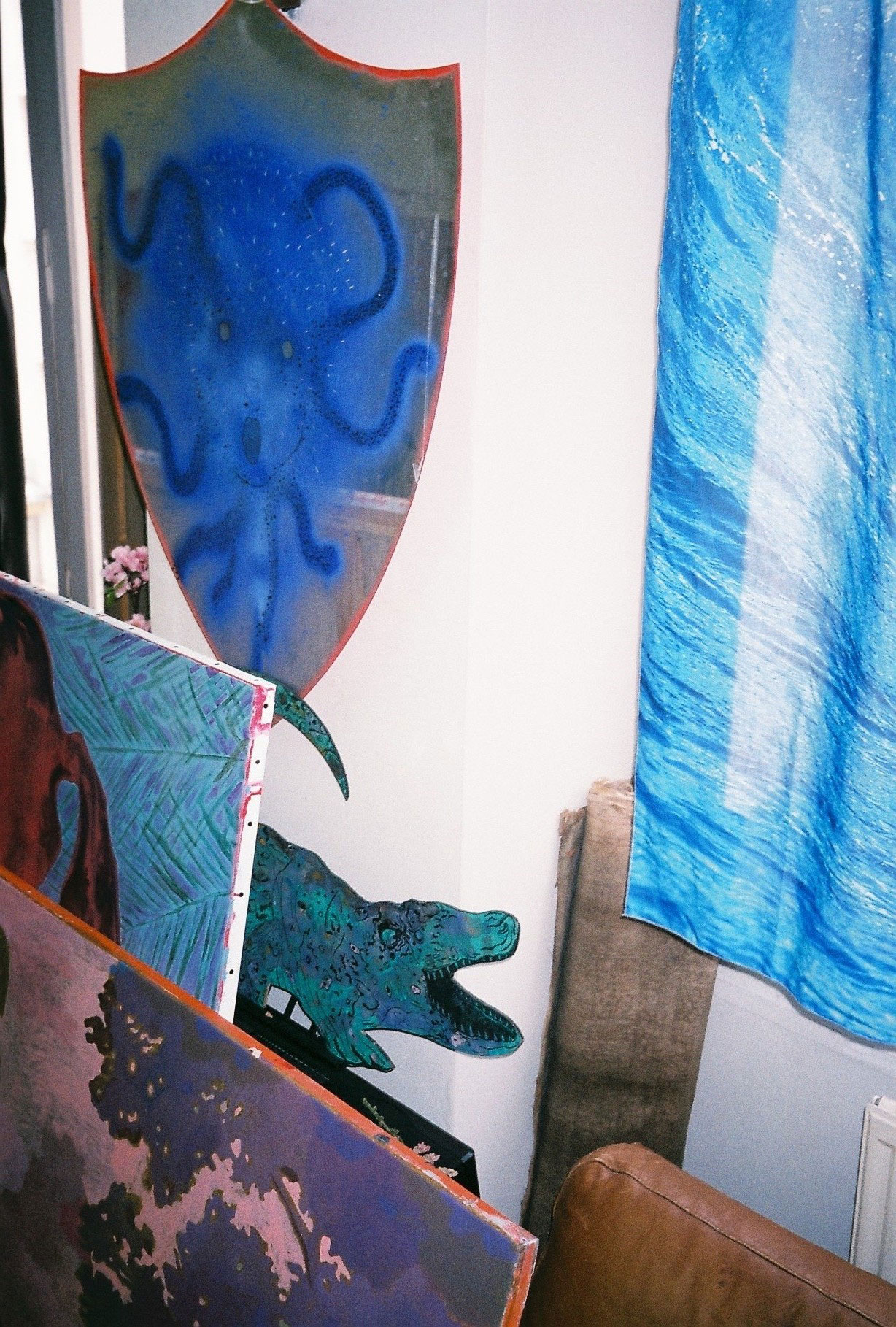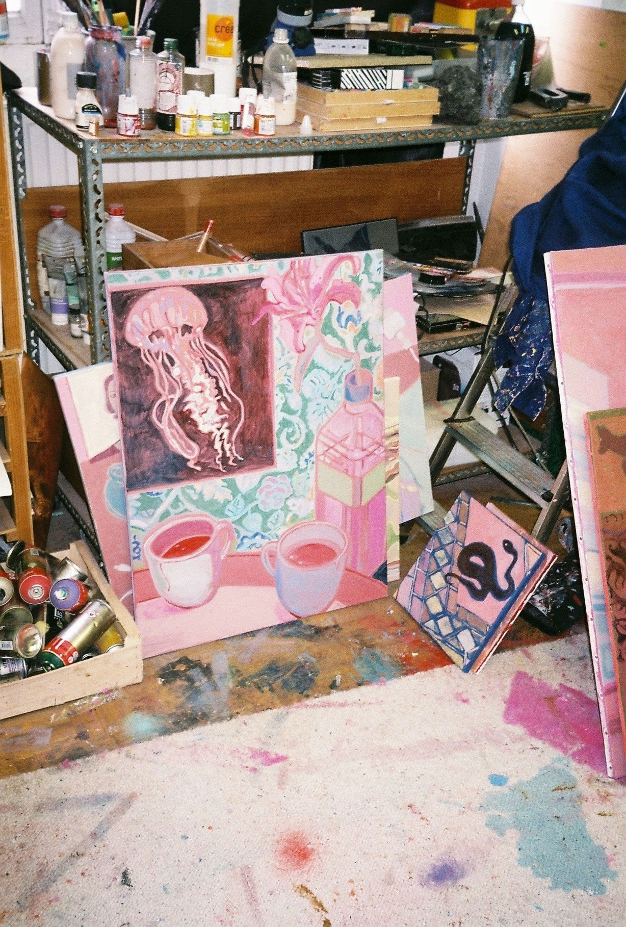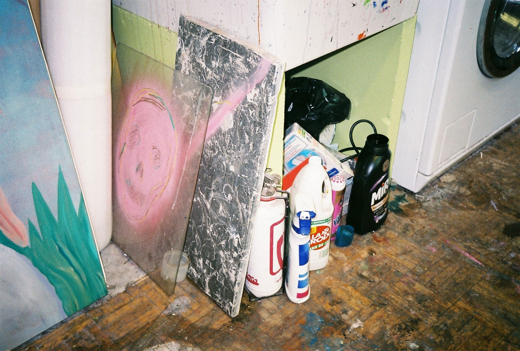 Inside artist Marcella Barceló’s Paris apartment lives a parallel world of colorful creatures that seem to come straight from a terrorific dream: a cigarette smoking spider, an abnormally large crow and an intimidating jellyfish. Despite their daunting appearance and native outdoor habitats, the painted characters don’t often have external exposure. Like some torpid creature that hibernates in caves, Marcella often spends weeks without going out of her live-work studio, where her work is produced in an atmosphere of darkness and isolation. The artist obstructs any natural light that enters the domestic space with pitch black curtains, enabling her to work for days through artificial glares. In addition, this dim setting enhances the painting’s supernatural colour palette exposing its viewers to a tantalizing adventure alongside kitsch references and surreal depictions made up of bright purple volcanoes and electric pink cocktail drinks. Through figurative representations of daily life moments, including a citrus being stripped with bare hands and an adolescent gently fitting in her socks, the artist captures very intimate, erotic bodily gestures. With the exception of her twister party friends that probably gather there in order to sneak-peek at the unusual beings, she is pretty much these characters’ sole company. Sensing a tender but tense mood, anticipated by the spilled paint, scattered books, beheaded dolls and running tap water as spotted in one of her canvases, her studio gives an enigmatic impression, whilst spellbind she performs a macabre birthing scene, materialized through painting.