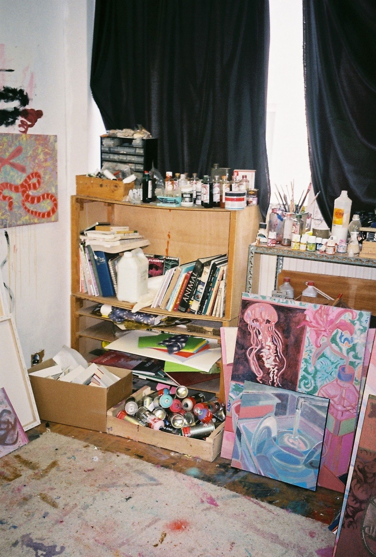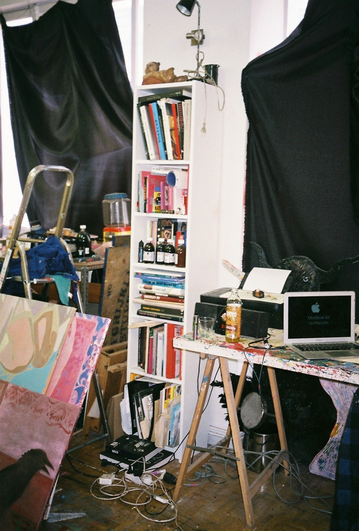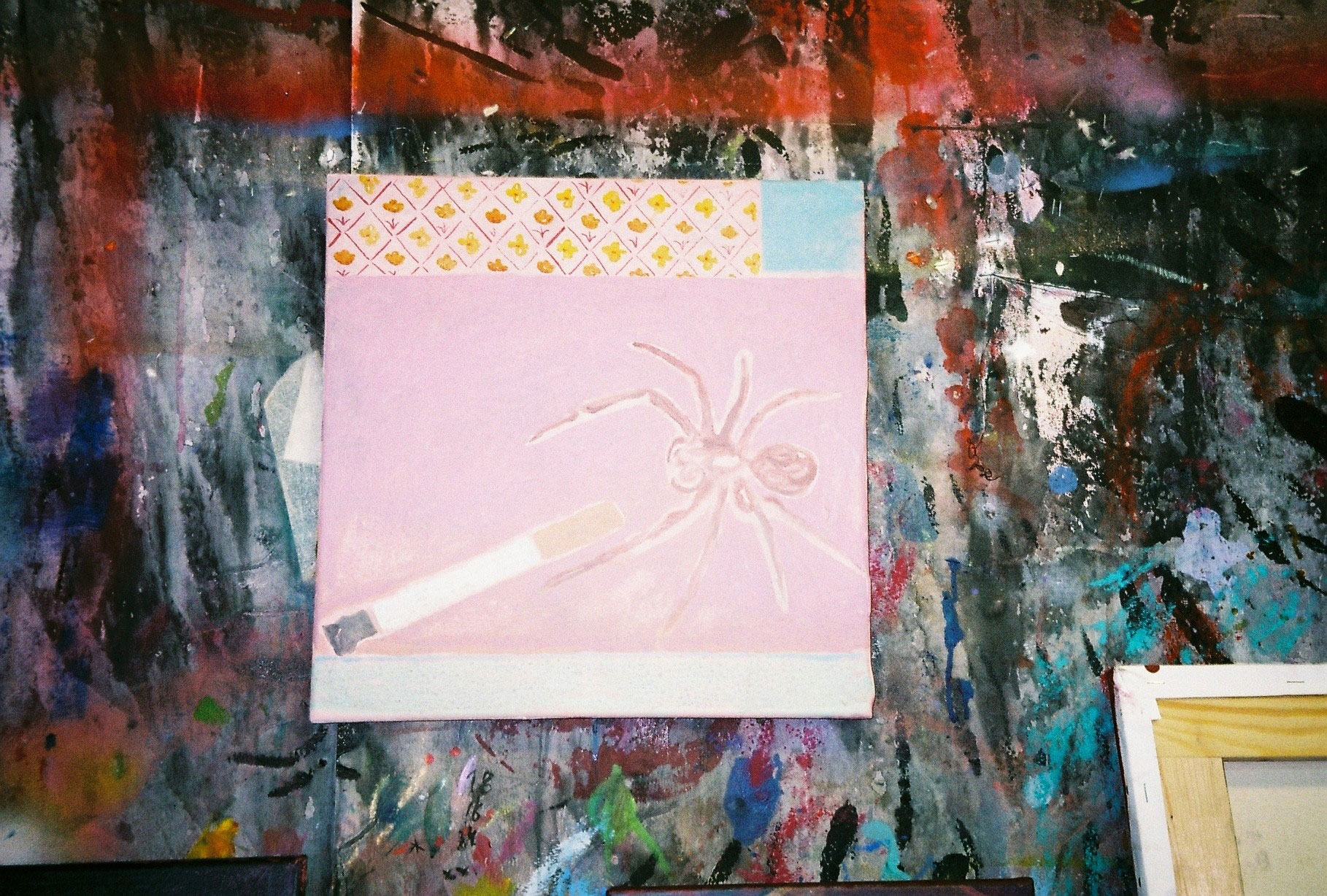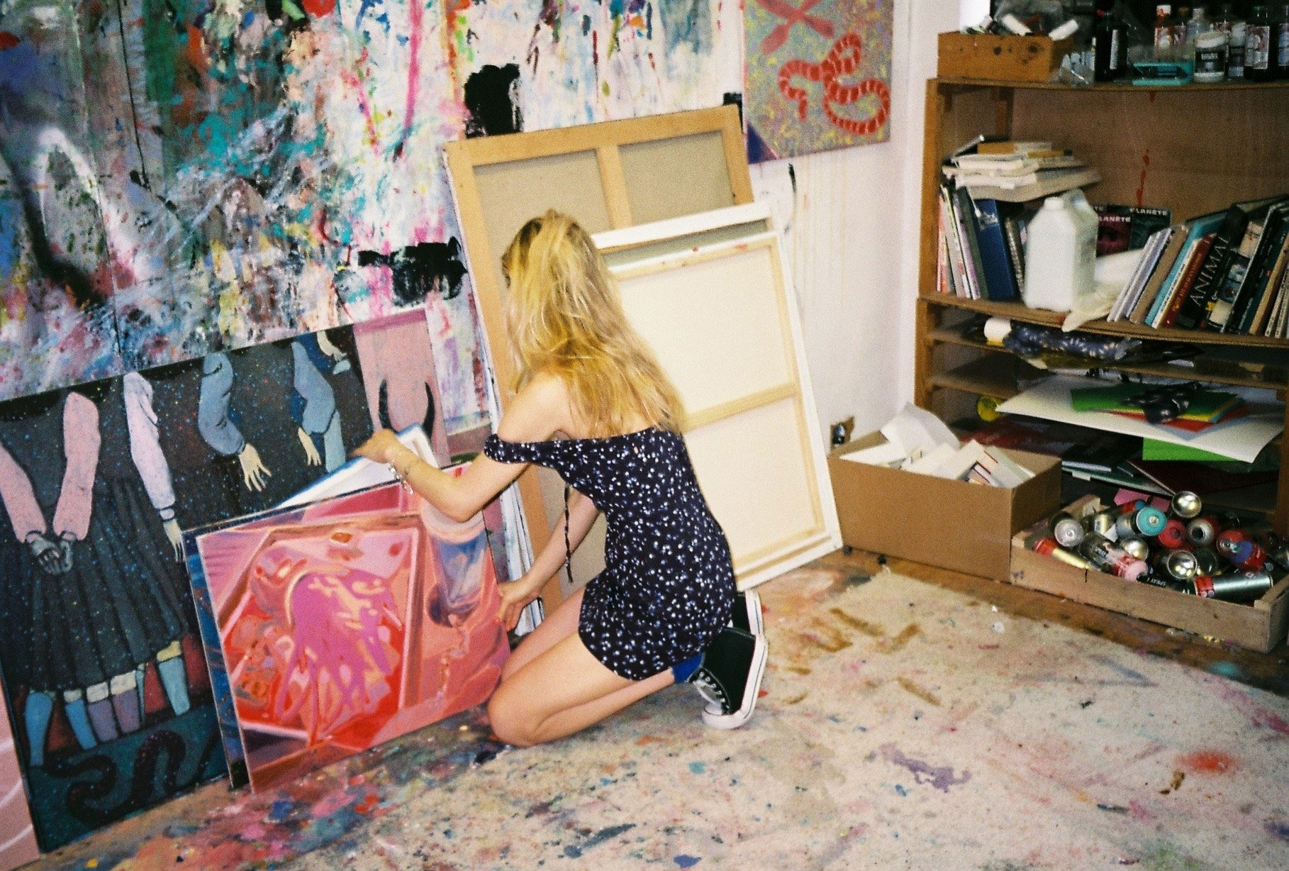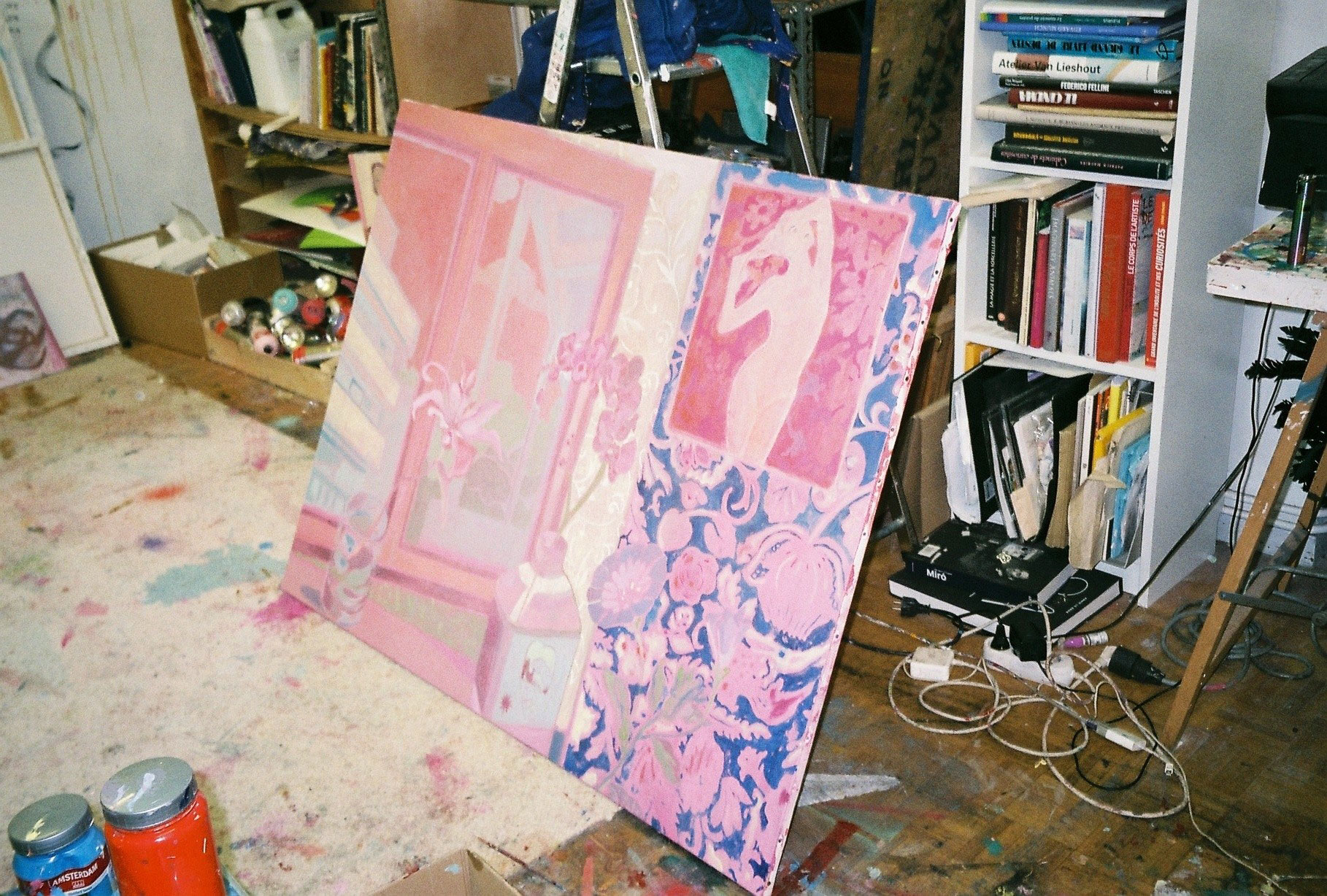 Inside artist Marcella Barceló’s Paris apartment lives a parallel world of colorful creatures that seem to come straight from a terrorific dream: a cigarette smoking spider, an abnormally large crow and an intimidating jellyfish. Despite their daunting appearance and native outdoor habitats, the painted characters don’t often have external exposure. Like some torpid creature that hibernates in caves, Marcella often spends weeks without going out of her live-work studio, where her work is produced in an atmosphere of darkness and isolation. The artist obstructs any natural light that enters the domestic space with pitch black curtains, enabling her to work for days through artificial glares. In addition, this dim setting enhances the painting’s supernatural colour palette exposing its viewers to a tantalizing adventure alongside kitsch references and surreal depictions made up of bright purple volcanoes and electric pink cocktail drinks. Through figurative representations of daily life moments, including a citrus being stripped with bare hands and an adolescent gently fitting in her socks, the artist captures very intimate, erotic bodily gestures. With the exception of her twister party friends that probably gather there in order to sneak-peek at the unusual beings, she is pretty much these characters’ sole company. Sensing a tender but tense mood, anticipated by the spilled paint, scattered books, beheaded dolls and running tap water as spotted in one of her canvases, her studio gives an enigmatic impression, whilst spellbind she performs a macabre birthing scene, materialized through painting.