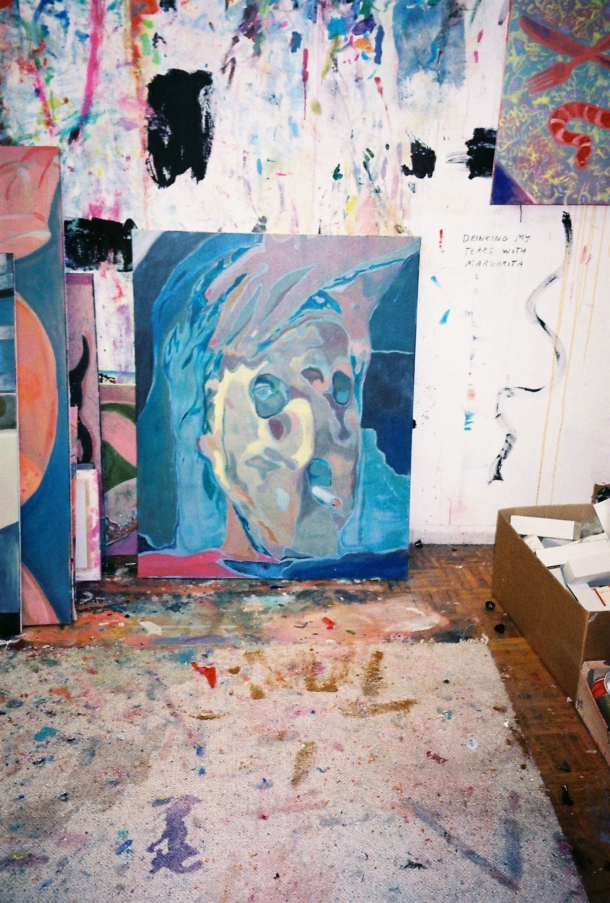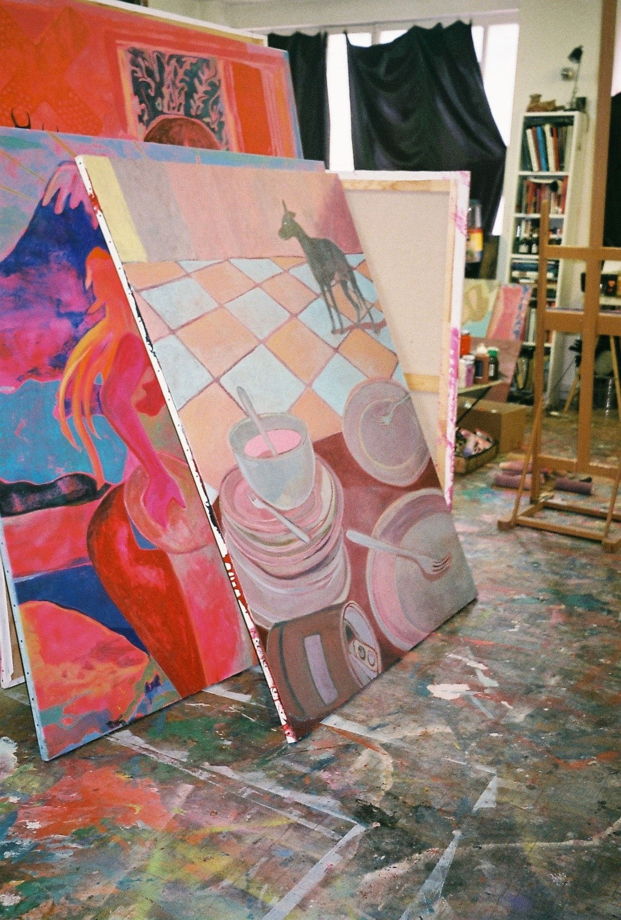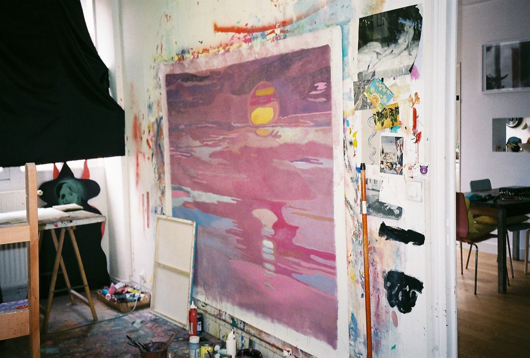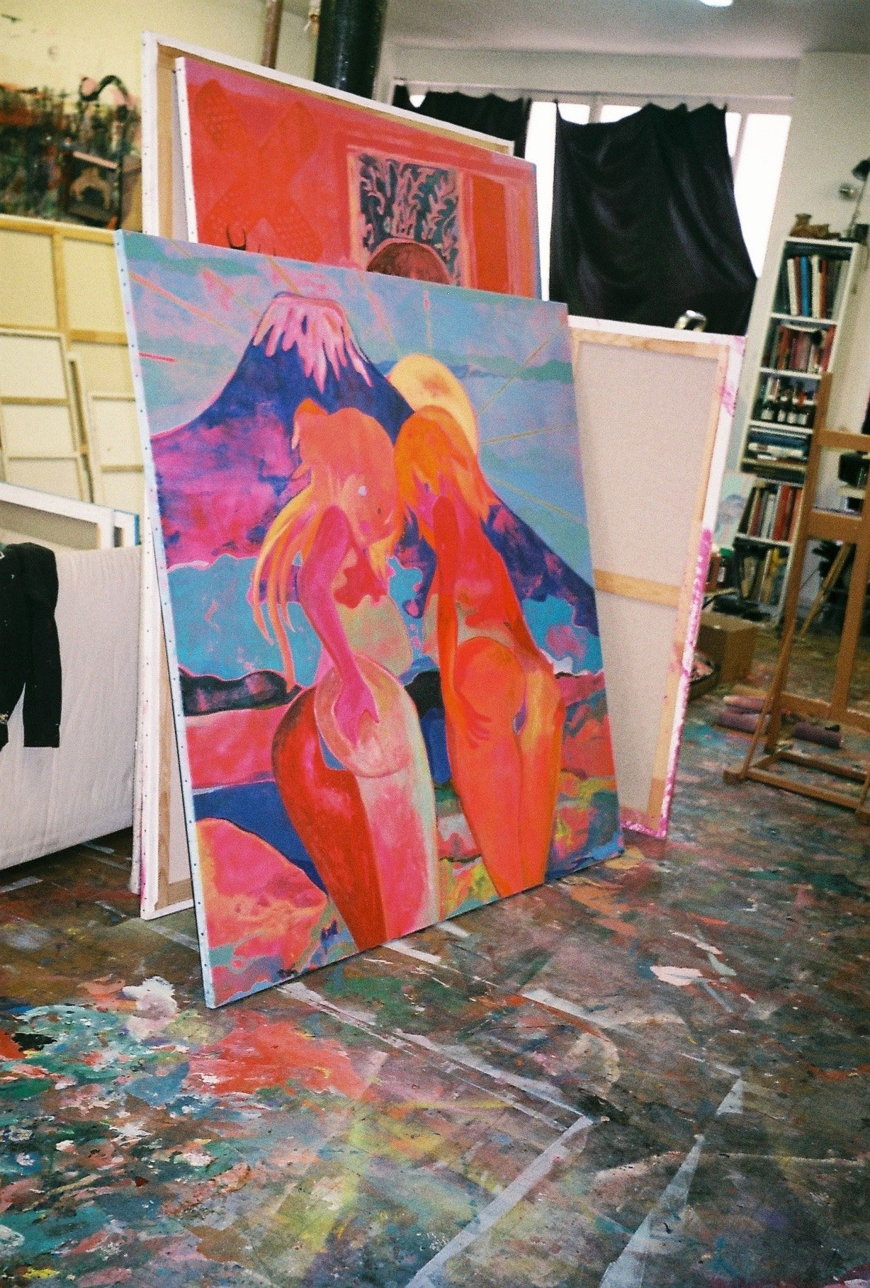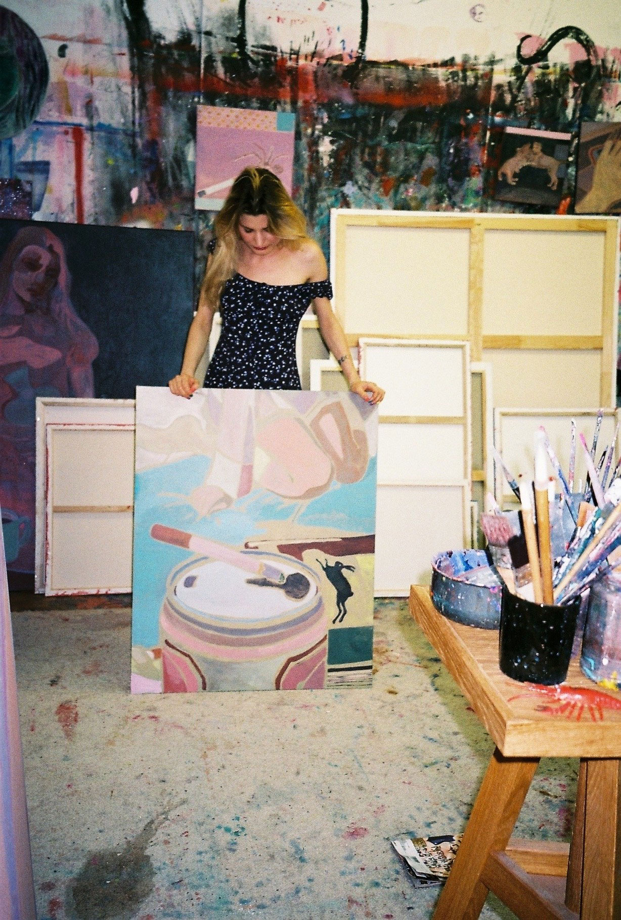 Inside artist Marcella Barceló’s Paris apartment lives a parallel world of colorful creatures that seem to come straight from a terrorific dream: a cigarette smoking spider, an abnormally large crow and an intimidating jellyfish. Despite their daunting appearance and native outdoor habitats, the painted characters don’t often have external exposure. Like some torpid creature that hibernates in caves, Marcella often spends weeks without going out of her live-work studio, where her work is produced in an atmosphere of darkness and isolation. The artist obstructs any natural light that enters the domestic space with pitch black curtains, enabling her to work for days through artificial glares. In addition, this dim setting enhances the painting’s supernatural colour palette exposing its viewers to a tantalizing adventure alongside kitsch references and surreal depictions made up of bright purple volcanoes and electric pink cocktail drinks. Through figurative representations of daily life moments, including a citrus being stripped with bare hands and an adolescent gently fitting in her socks, the artist captures very intimate, erotic bodily gestures. With the exception of her twister party friends that probably gather there in order to sneak-peek at the unusual beings, she is pretty much these characters’ sole company. Sensing a tender but tense mood, anticipated by the spilled paint, scattered books, beheaded dolls and running tap water as spotted in one of her canvases, her studio gives an enigmatic impression, whilst spellbind she performs a macabre birthing scene, materialized through painting.