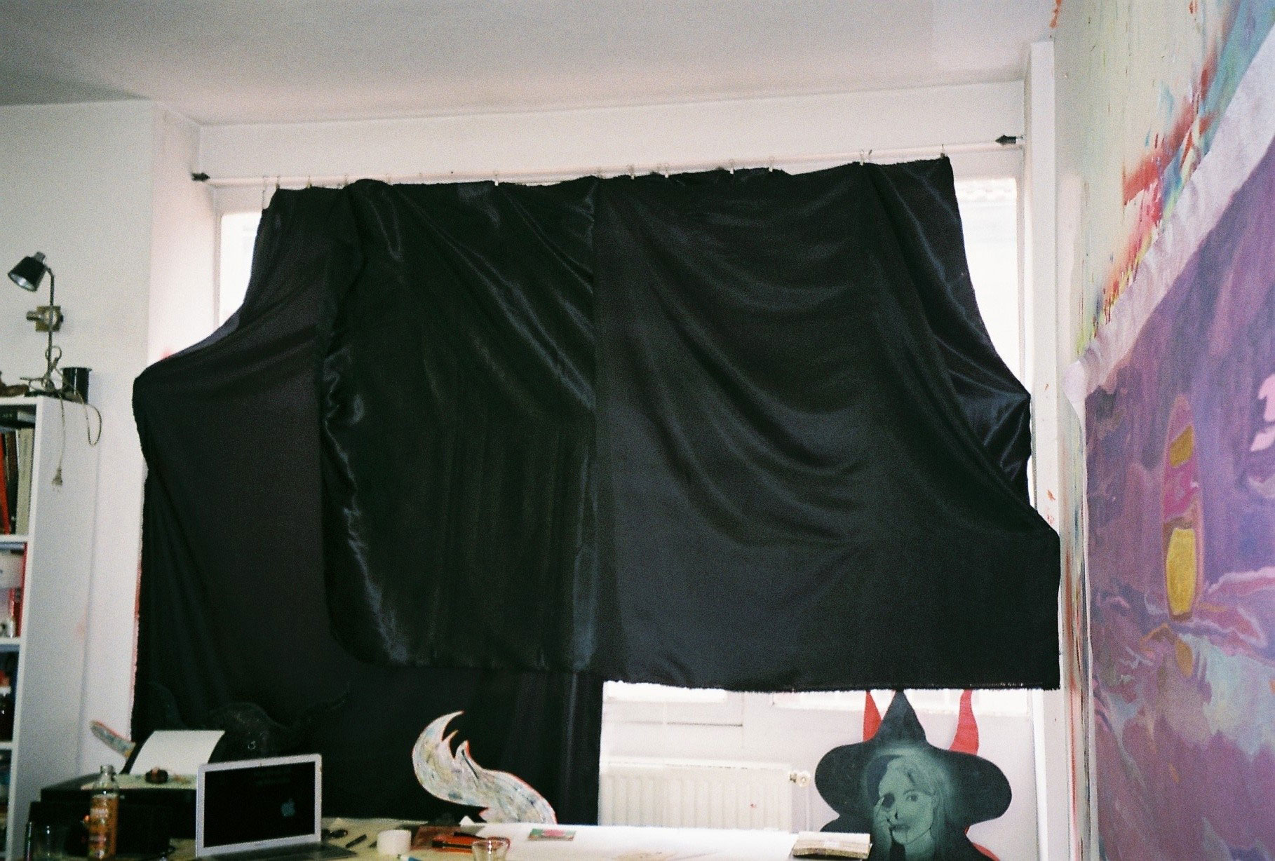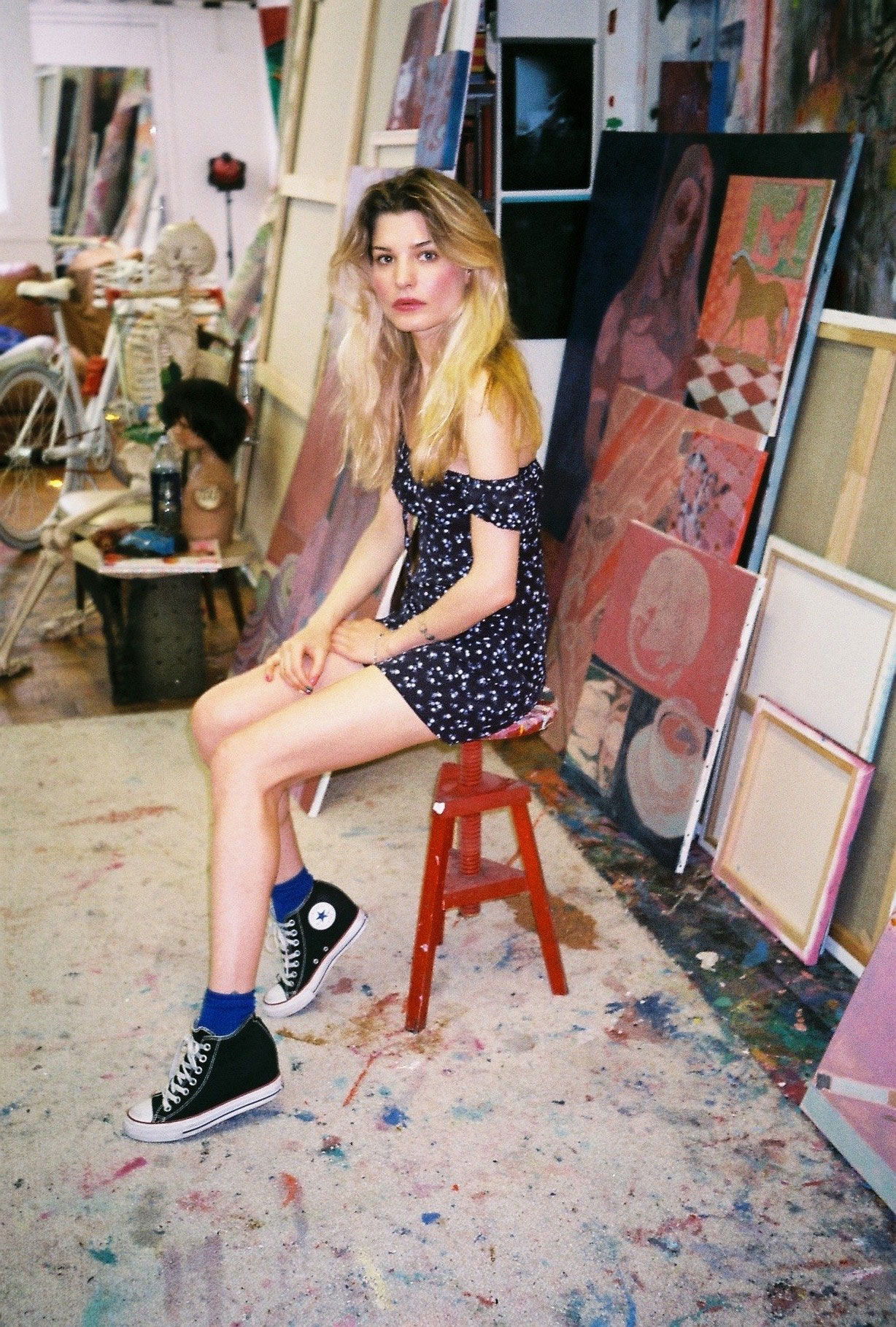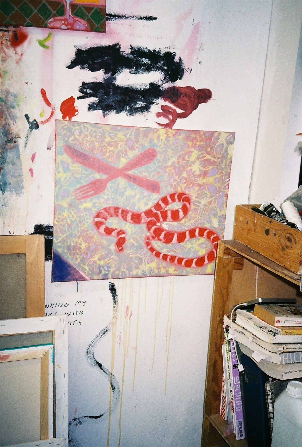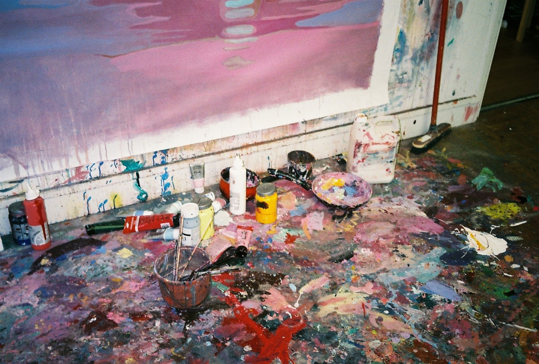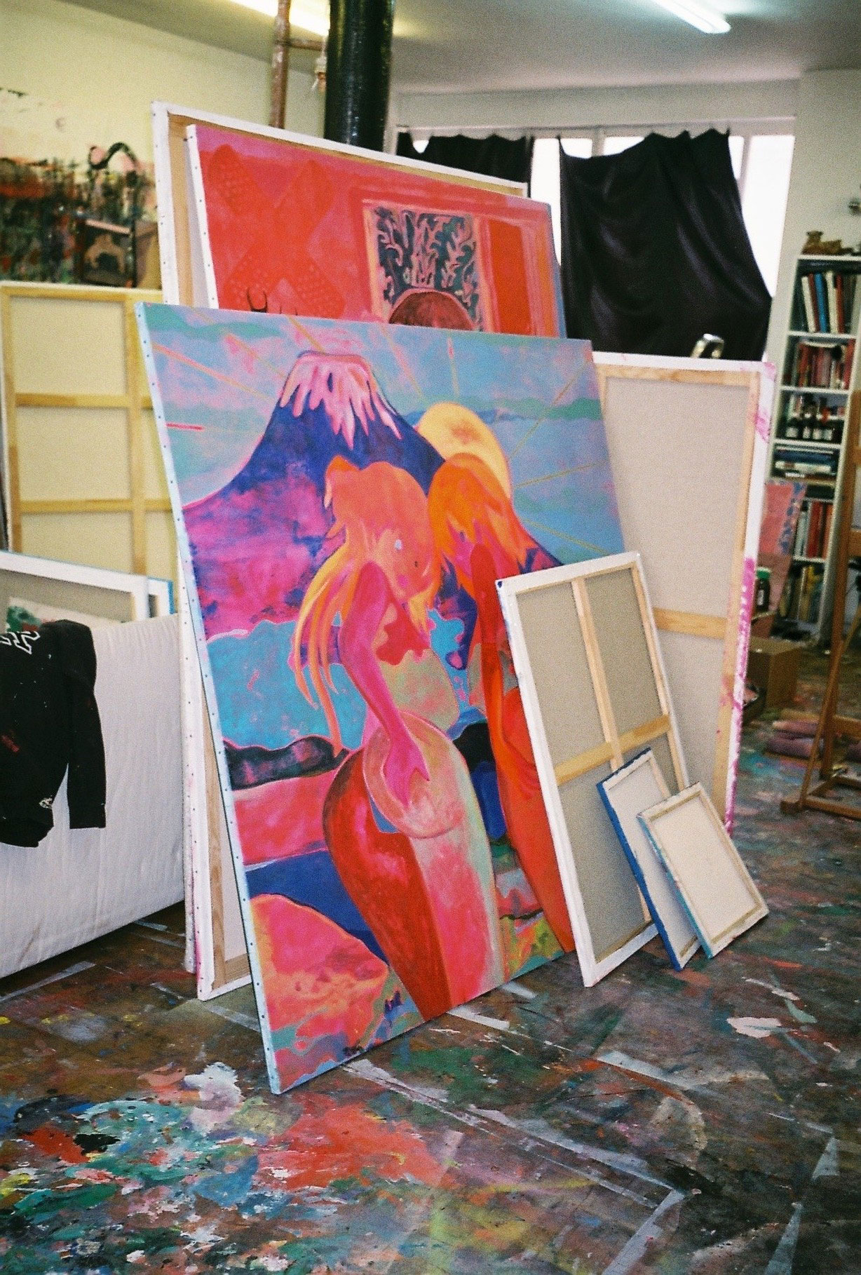 Inside artist Marcella Barceló’s Paris apartment lives a parallel world of colorful creatures that seem to come straight from a terrorific dream: a cigarette smoking spider, an abnormally large crow and an intimidating jellyfish. Despite their daunting appearance and native outdoor habitats, the painted characters don’t often have external exposure. Like some torpid creature that hibernates in caves, Marcella often spends weeks without going out of her live-work studio, where her work is produced in an atmosphere of darkness and isolation. The artist obstructs any natural light that enters the domestic space with pitch black curtains, enabling her to work for days through artificial glares. In addition, this dim setting enhances the painting’s supernatural colour palette exposing its viewers to a tantalizing adventure alongside kitsch references and surreal depictions made up of bright purple volcanoes and electric pink cocktail drinks. Through figurative representations of daily life moments, including a citrus being stripped with bare hands and an adolescent gently fitting in her socks, the artist captures very intimate, erotic bodily gestures. With the exception of her twister party friends that probably gather there in order to sneak-peek at the unusual beings, she is pretty much these characters’ sole company. Sensing a tender but tense mood, anticipated by the spilled paint, scattered books, beheaded dolls and running tap water as spotted in one of her canvases, her studio gives an enigmatic impression, whilst spellbind she performs a macabre birthing scene, materialized through painting.