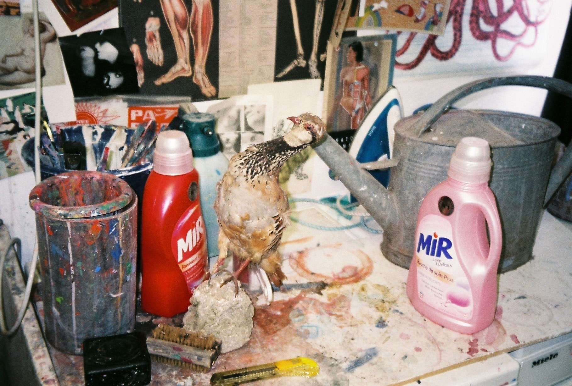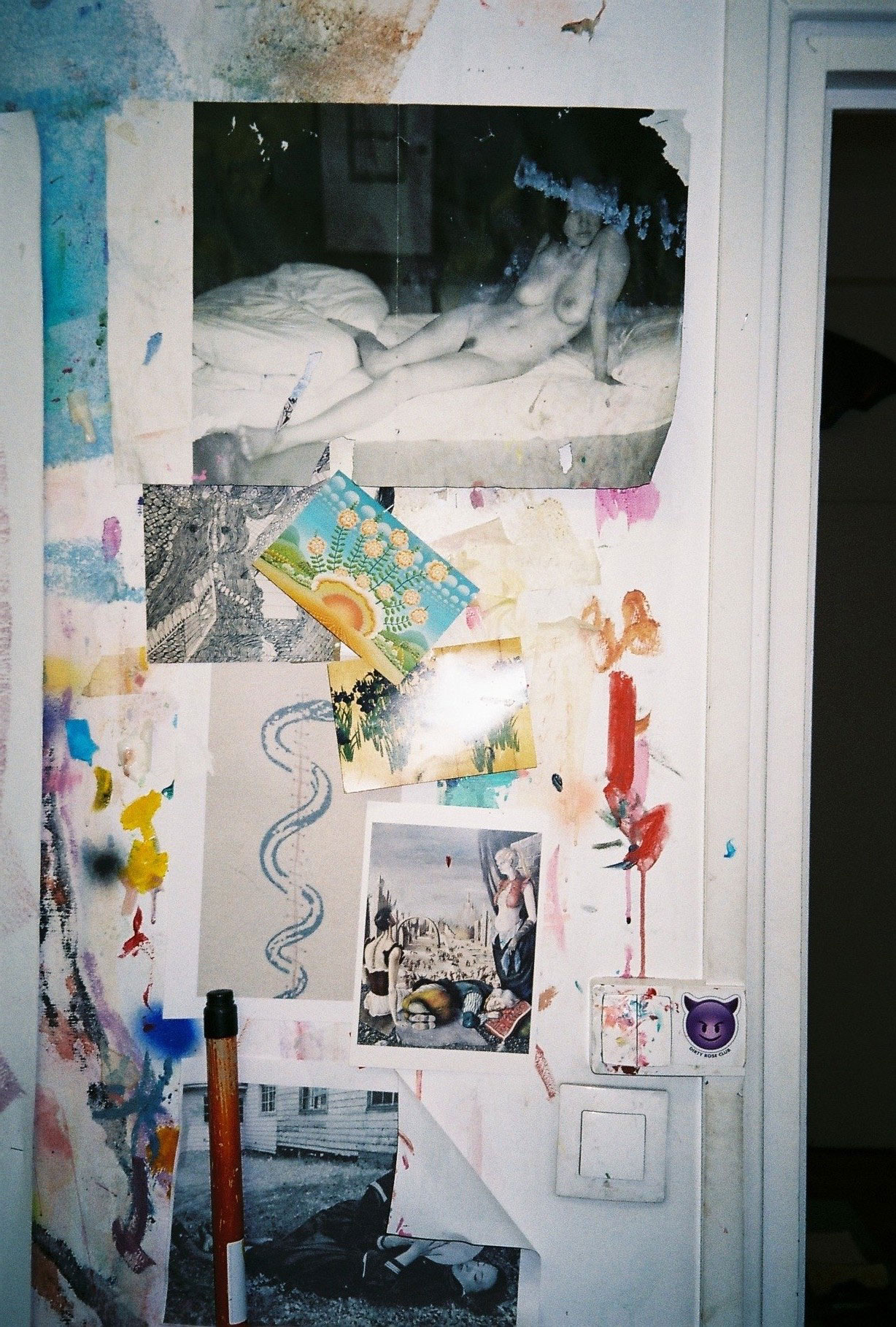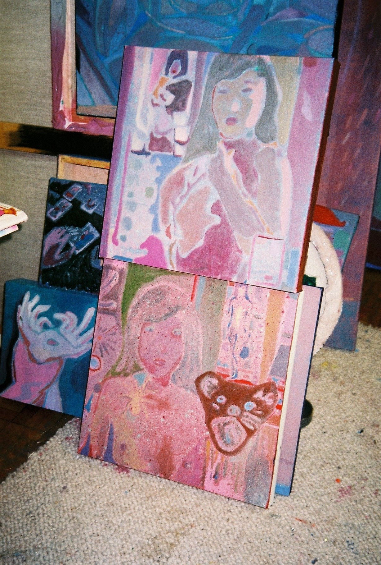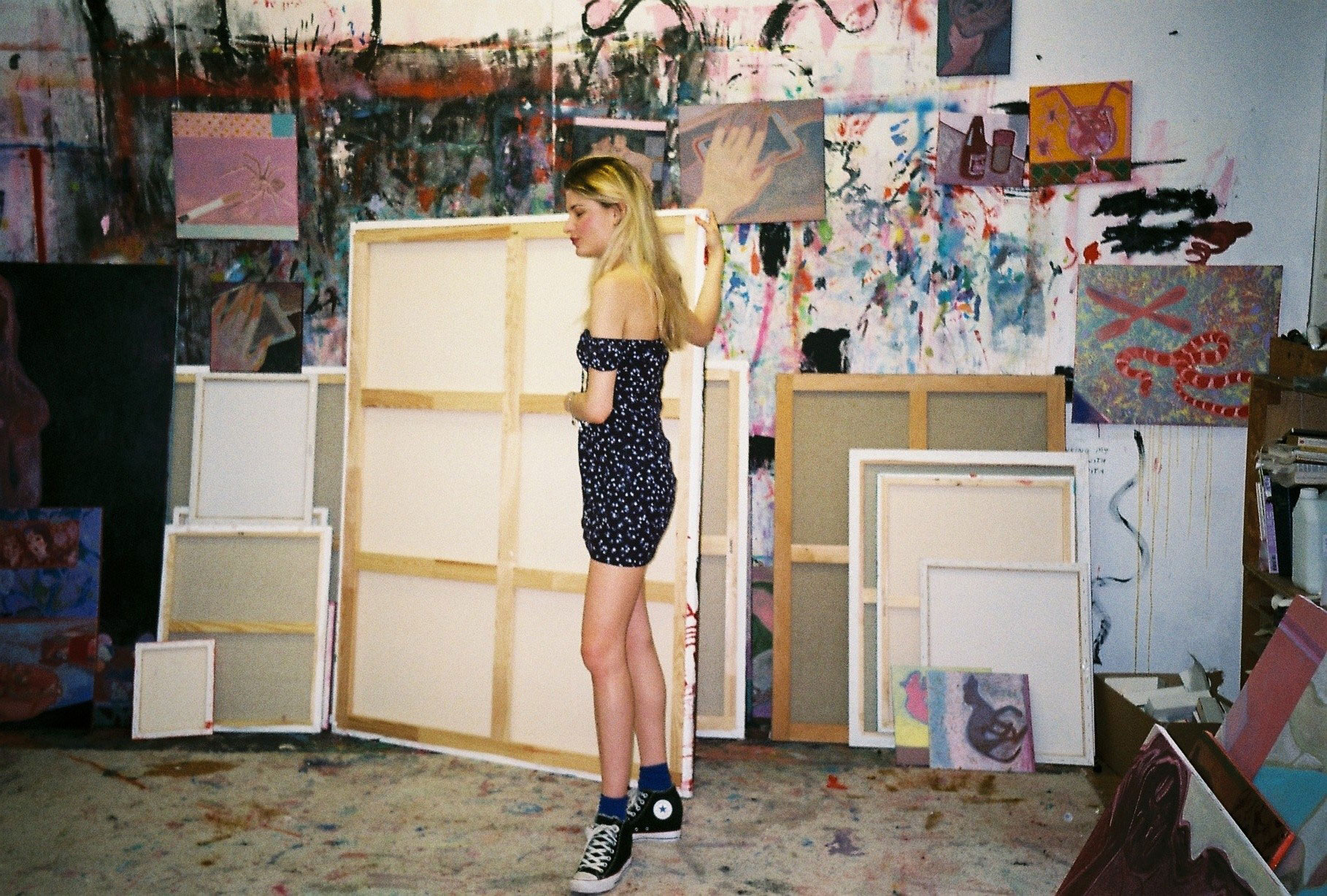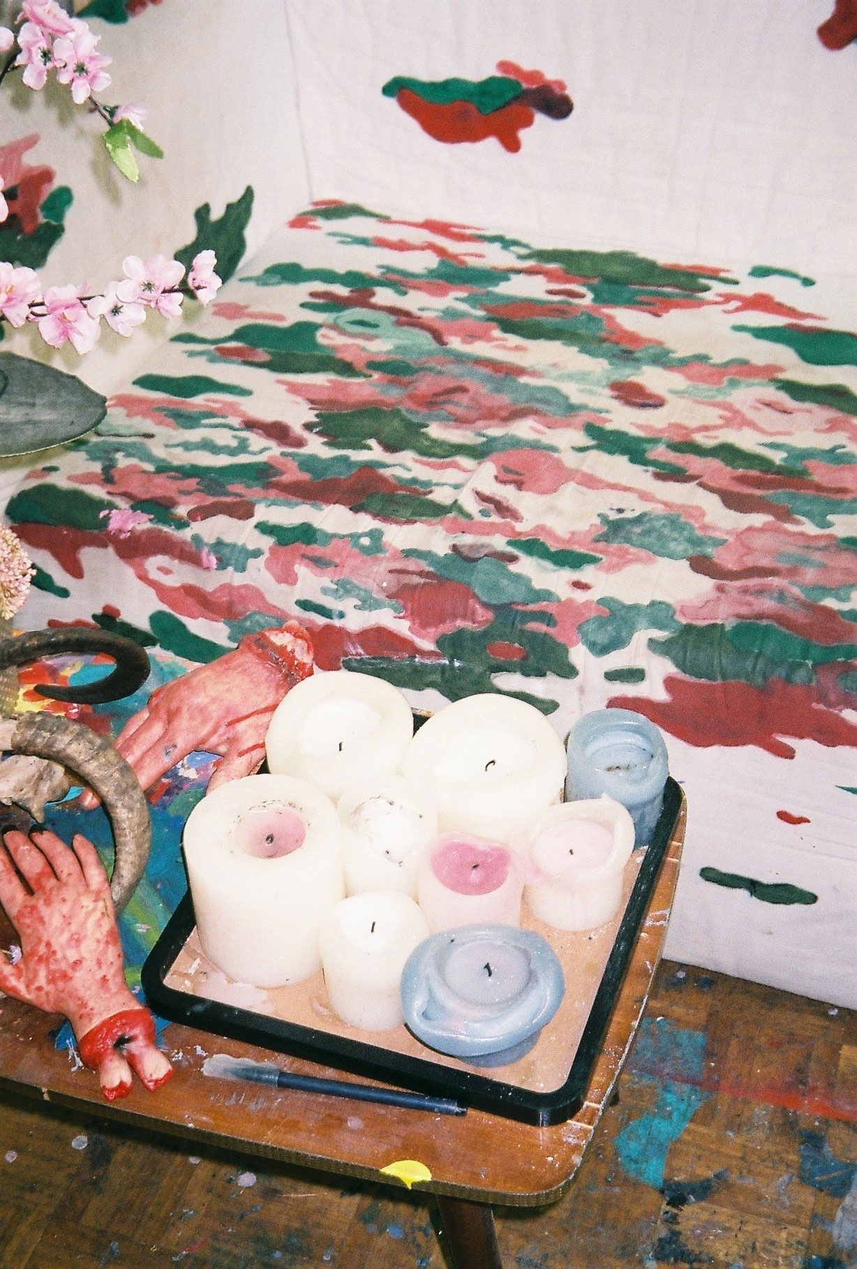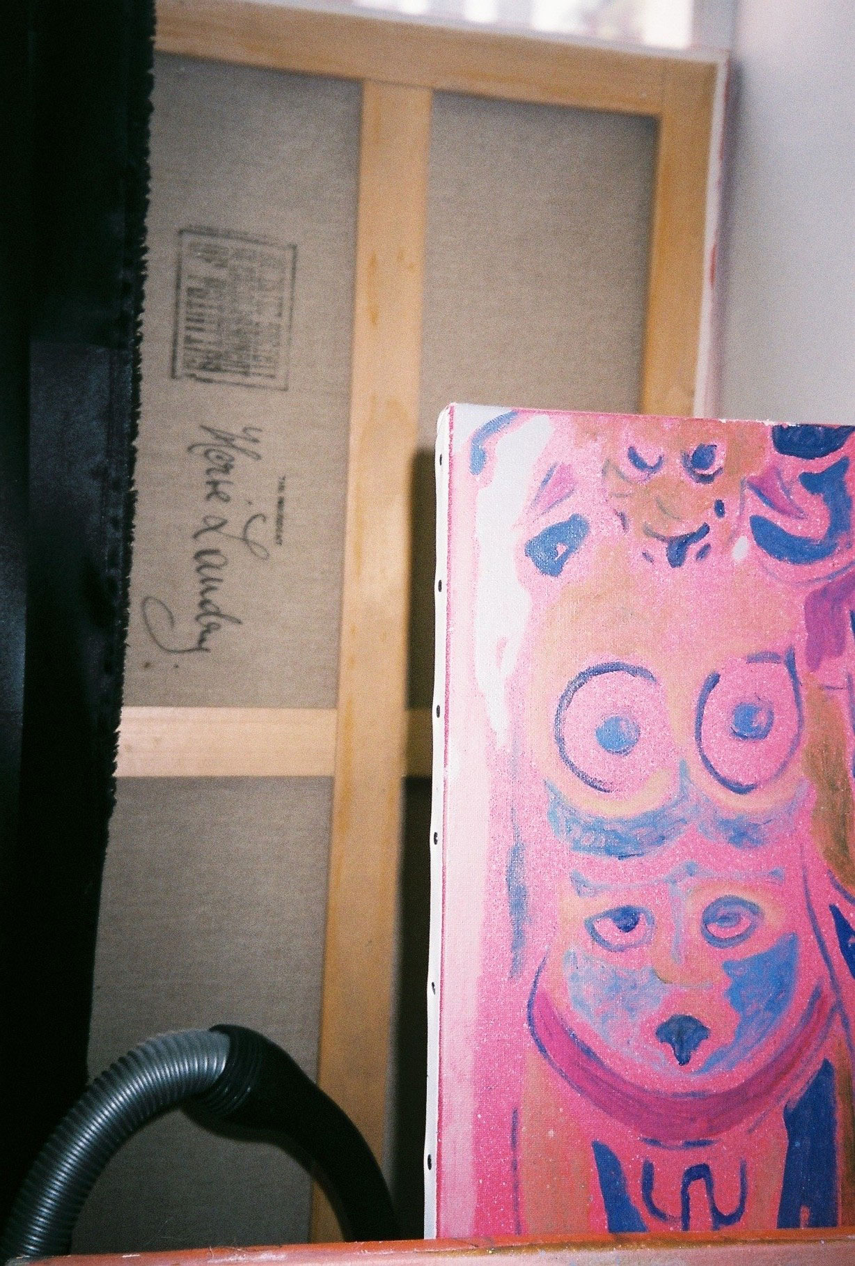 Inside artist Marcella Barceló’s Paris apartment lives a parallel world of colorful creatures that seem to come straight from a terrorific dream: a cigarette smoking spider, an abnormally large crow and an intimidating jellyfish. Despite their daunting appearance and native outdoor habitats, the painted characters don’t often have external exposure. Like some torpid creature that hibernates in caves, Marcella often spends weeks without going out of her live-work studio, where her work is produced in an atmosphere of darkness and isolation. The artist obstructs any natural light that enters the domestic space with pitch black curtains, enabling her to work for days through artificial glares. In addition, this dim setting enhances the painting’s supernatural colour palette exposing its viewers to a tantalizing adventure alongside kitsch references and surreal depictions made up of bright purple volcanoes and electric pink cocktail drinks. Through figurative representations of daily life moments, including a citrus being stripped with bare hands and an adolescent gently fitting in her socks, the artist captures very intimate, erotic bodily gestures. With the exception of her twister party friends that probably gather there in order to sneak-peek at the unusual beings, she is pretty much these characters’ sole company. Sensing a tender but tense mood, anticipated by the spilled paint, scattered books, beheaded dolls and running tap water as spotted in one of her canvases, her studio gives an enigmatic impression, whilst spellbind she performs a macabre birthing scene, materialized through painting.