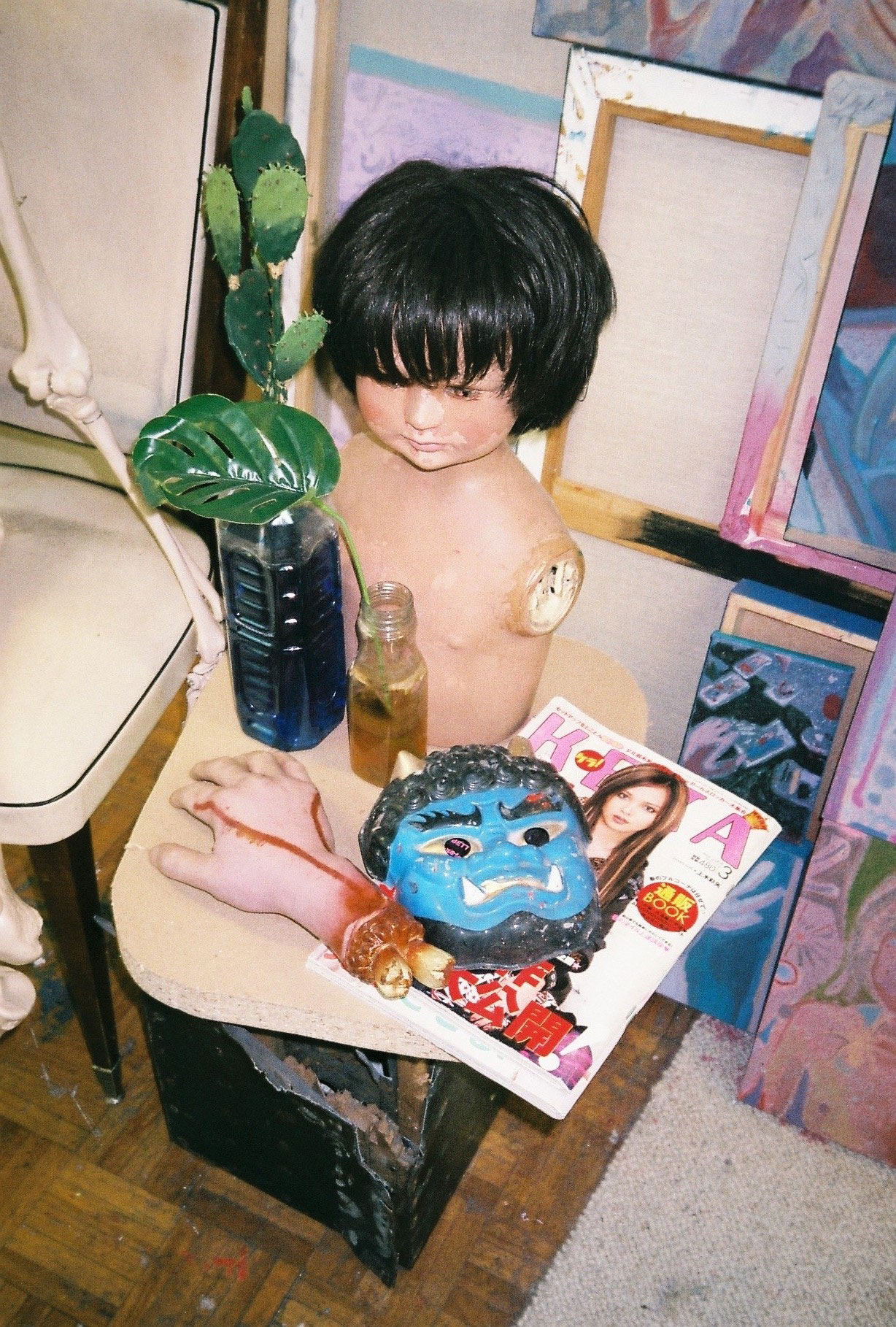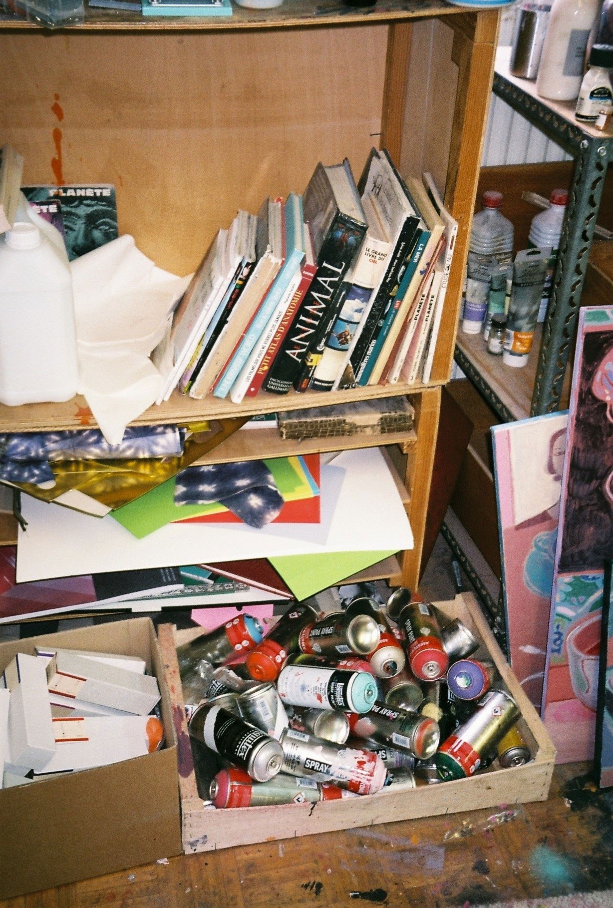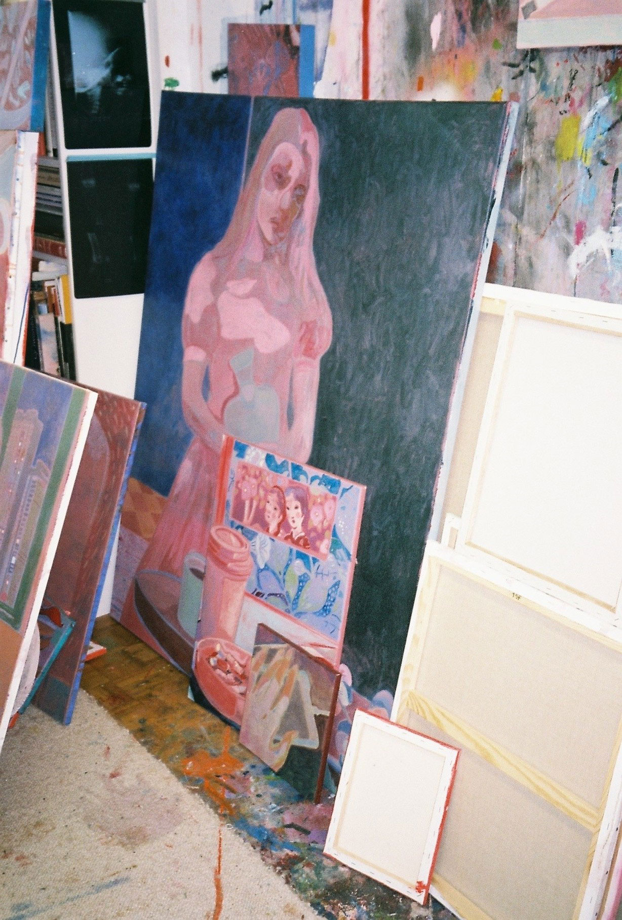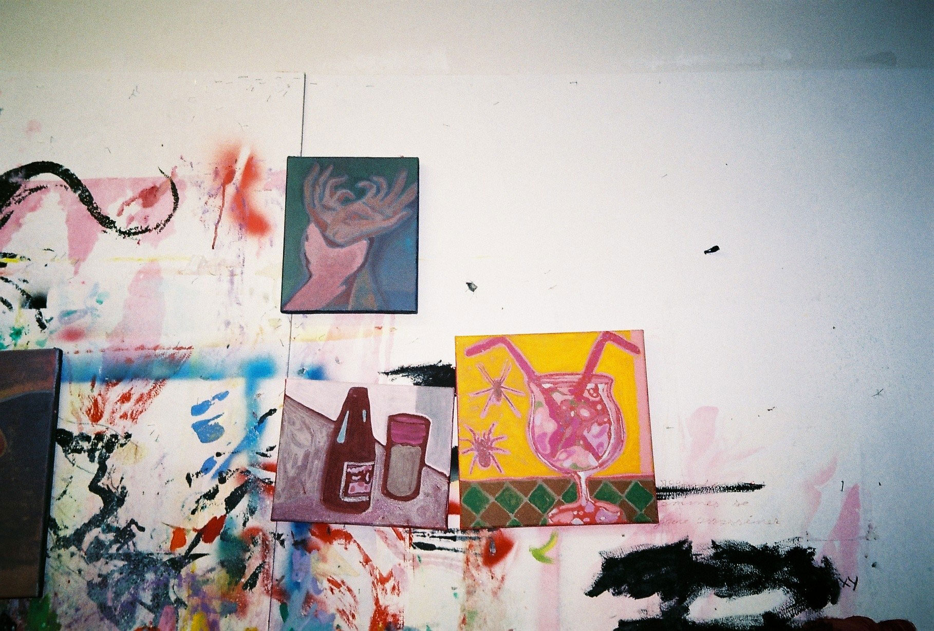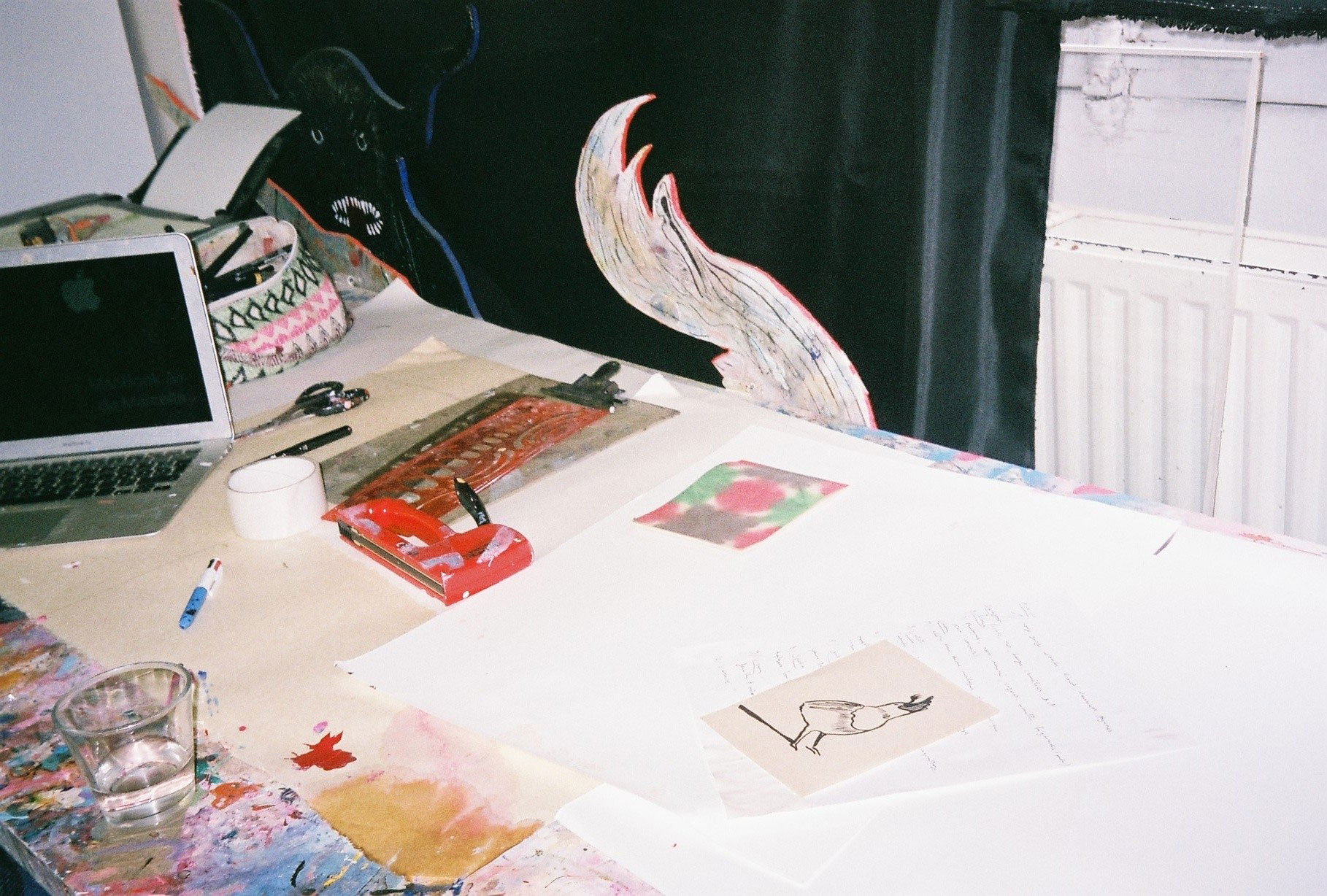 Inside artist Marcella Barceló’s Paris apartment lives a parallel world of colorful creatures that seem to come straight from a terrorific dream: a cigarette smoking spider, an abnormally large crow and an intimidating jellyfish. Despite their daunting appearance and native outdoor habitats, the painted characters don’t often have external exposure. Like some torpid creature that hibernates in caves, Marcella often spends weeks without going out of her live-work studio, where her work is produced in an atmosphere of darkness and isolation. The artist obstructs any natural light that enters the domestic space with pitch black curtains, enabling her to work for days through artificial glares. In addition, this dim setting enhances the painting’s supernatural colour palette exposing its viewers to a tantalizing adventure alongside kitsch references and surreal depictions made up of bright purple volcanoes and electric pink cocktail drinks. Through figurative representations of daily life moments, including a citrus being stripped with bare hands and an adolescent gently fitting in her socks, the artist captures very intimate, erotic bodily gestures. With the exception of her twister party friends that probably gather there in order to sneak-peek at the unusual beings, she is pretty much these characters’ sole company. Sensing a tender but tense mood, anticipated by the spilled paint, scattered books, beheaded dolls and running tap water as spotted in one of her canvases, her studio gives an enigmatic impression, whilst spellbind she performs a macabre birthing scene, materialized through painting.
