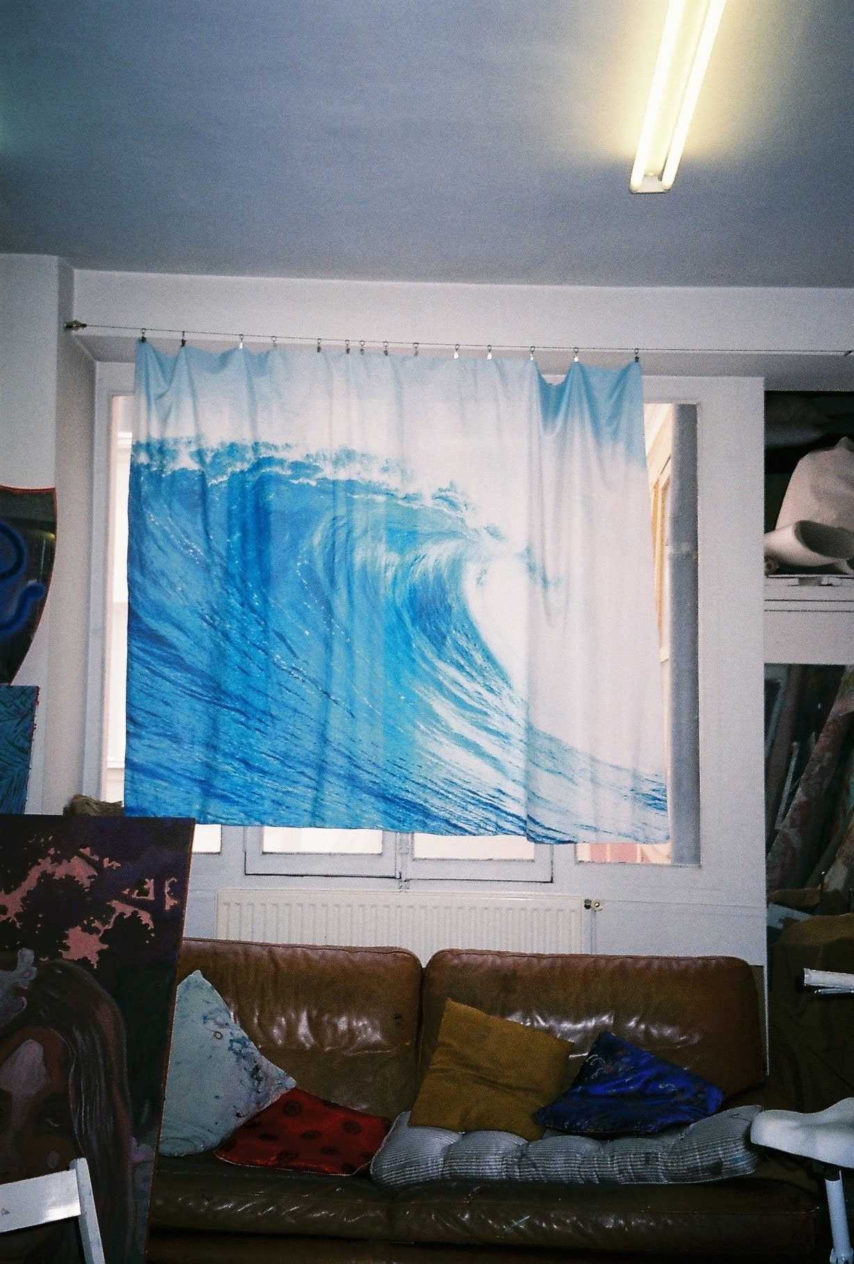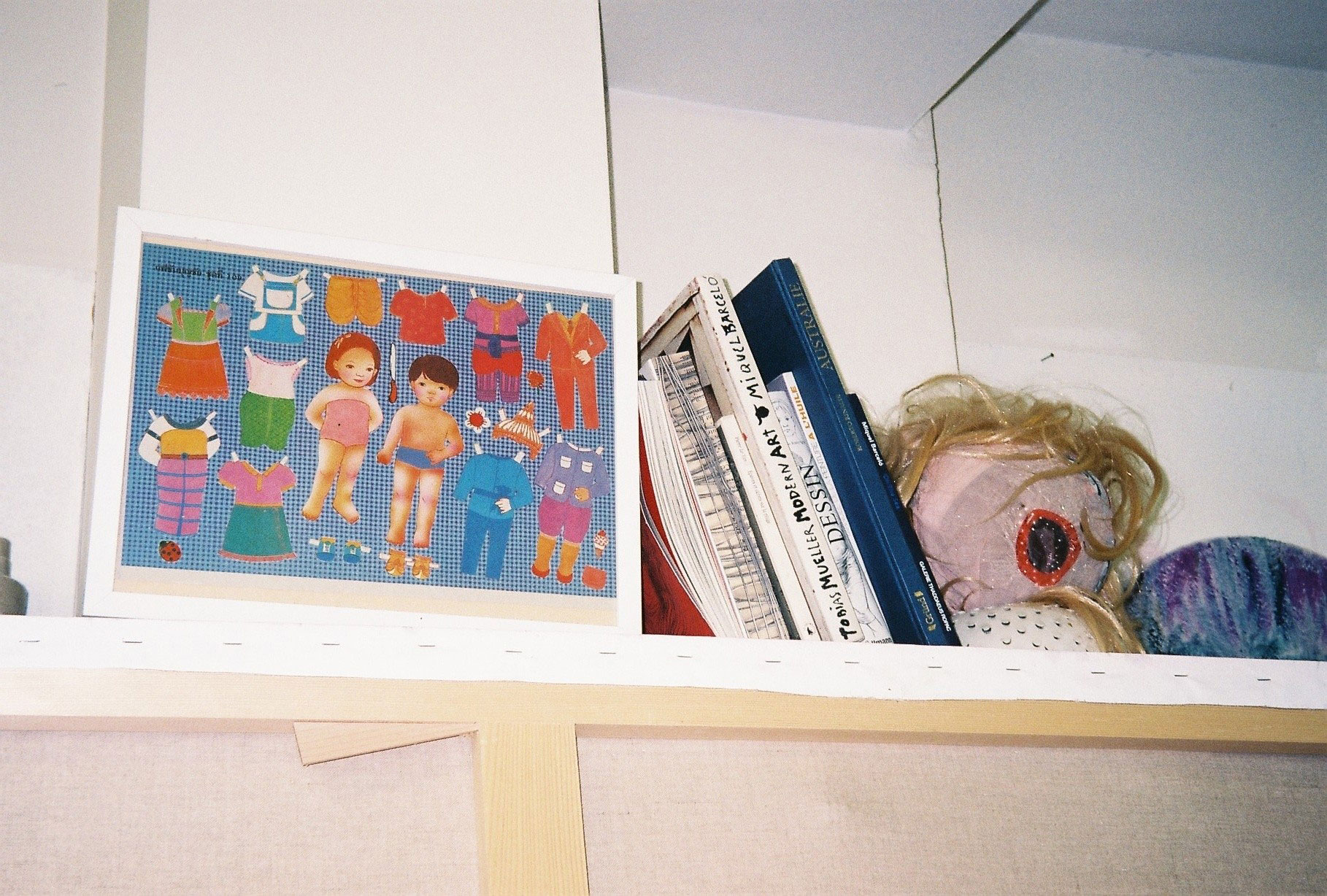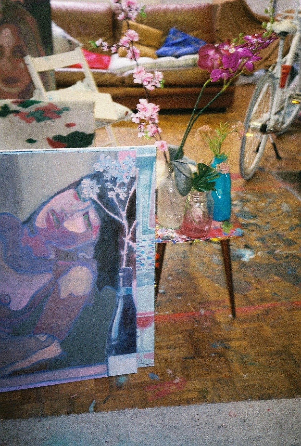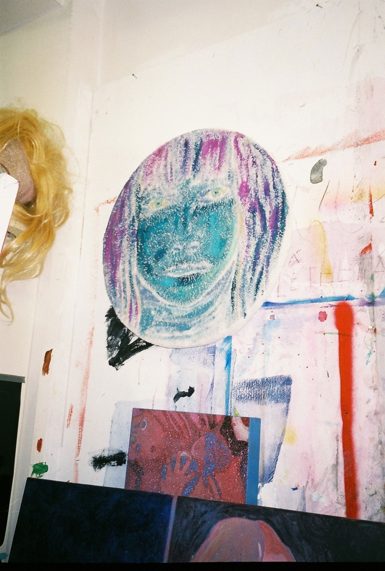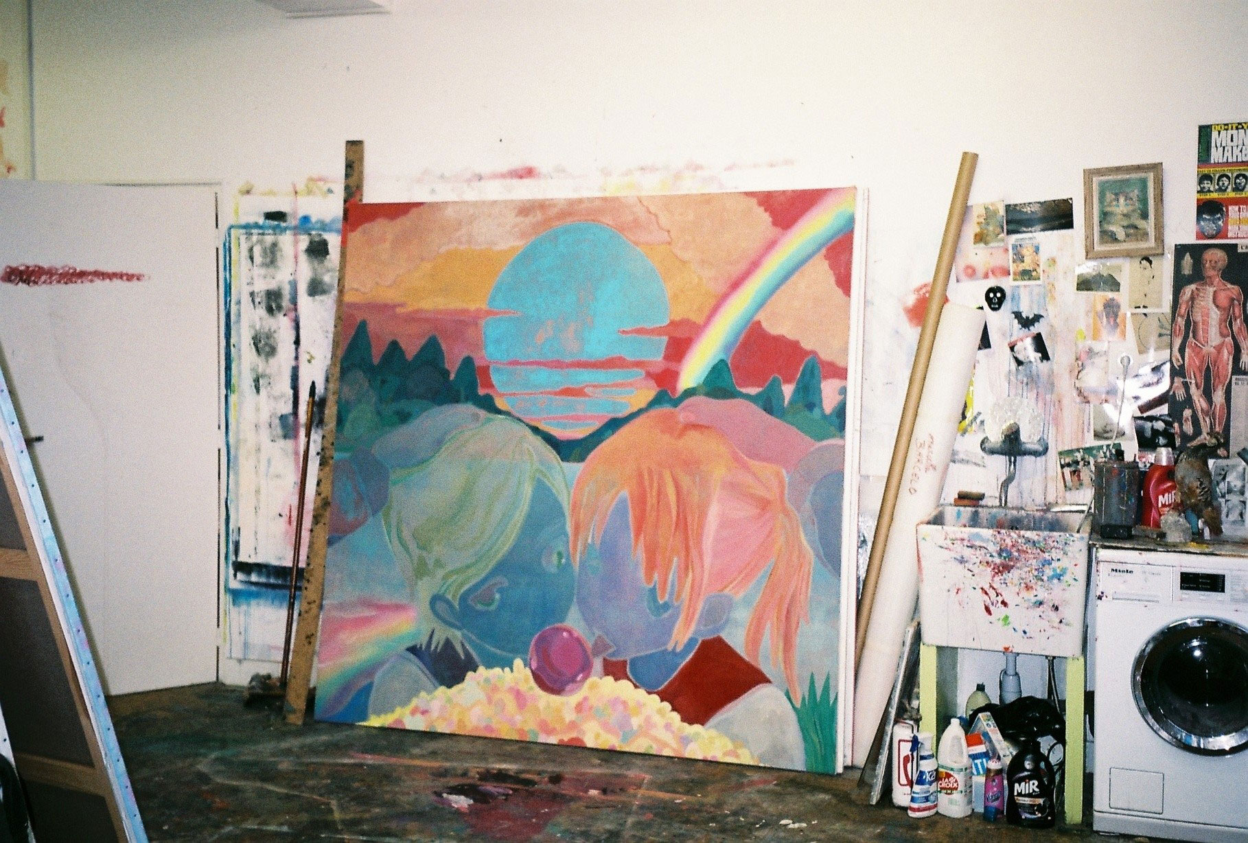 Inside artist Marcella Barceló’s Paris apartment lives a parallel world of colorful creatures that seem to come straight from a terrorific dream: a cigarette smoking spider, an abnormally large crow and an intimidating jellyfish. Despite their daunting appearance and native outdoor habitats, the painted characters don’t often have external exposure. Like some torpid creature that hibernates in caves, Marcella often spends weeks without going out of her live-work studio, where her work is produced in an atmosphere of darkness and isolation. The artist obstructs any natural light that enters the domestic space with pitch black curtains, enabling her to work for days through artificial glares. In addition, this dim setting enhances the painting’s supernatural colour palette exposing its viewers to a tantalizing adventure alongside kitsch references and surreal depictions made up of bright purple volcanoes and electric pink cocktail drinks. Through figurative representations of daily life moments, including a citrus being stripped with bare hands and an adolescent gently fitting in her socks, the artist captures very intimate, erotic bodily gestures. With the exception of her twister party friends that probably gather there in order to sneak-peek at the unusual beings, she is pretty much these characters’ sole company. Sensing a tender but tense mood, anticipated by the spilled paint, scattered books, beheaded dolls and running tap water as spotted in one of her canvases, her studio gives an enigmatic impression, whilst spellbind she performs a macabre birthing scene, materialized through painting.