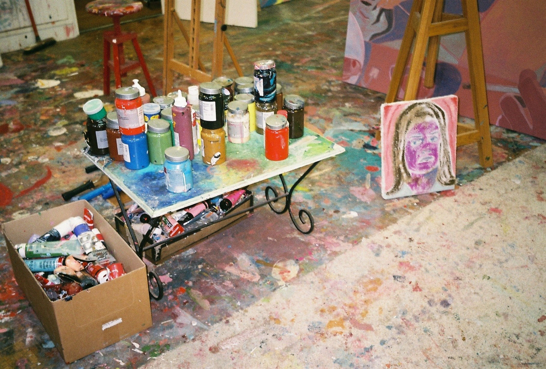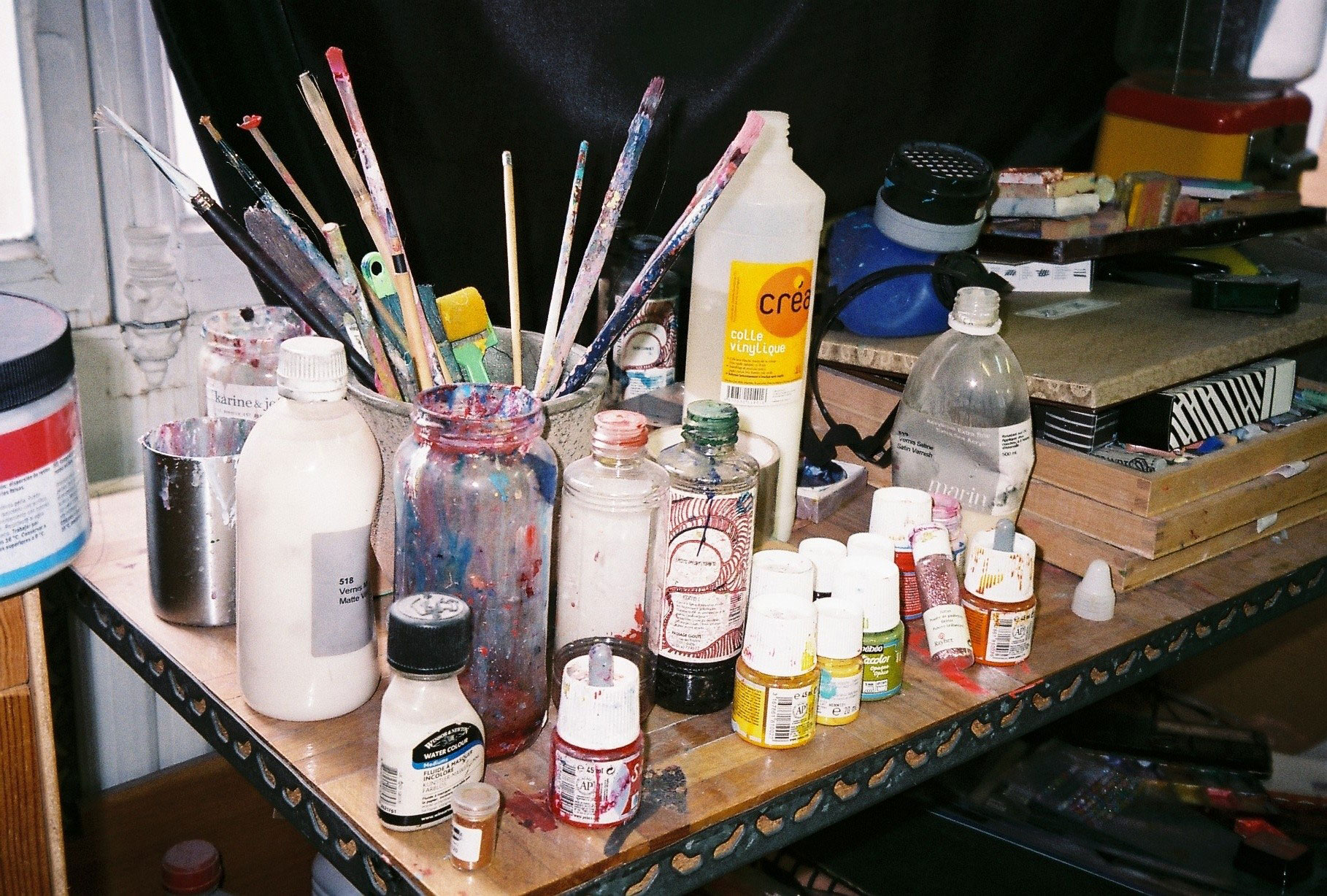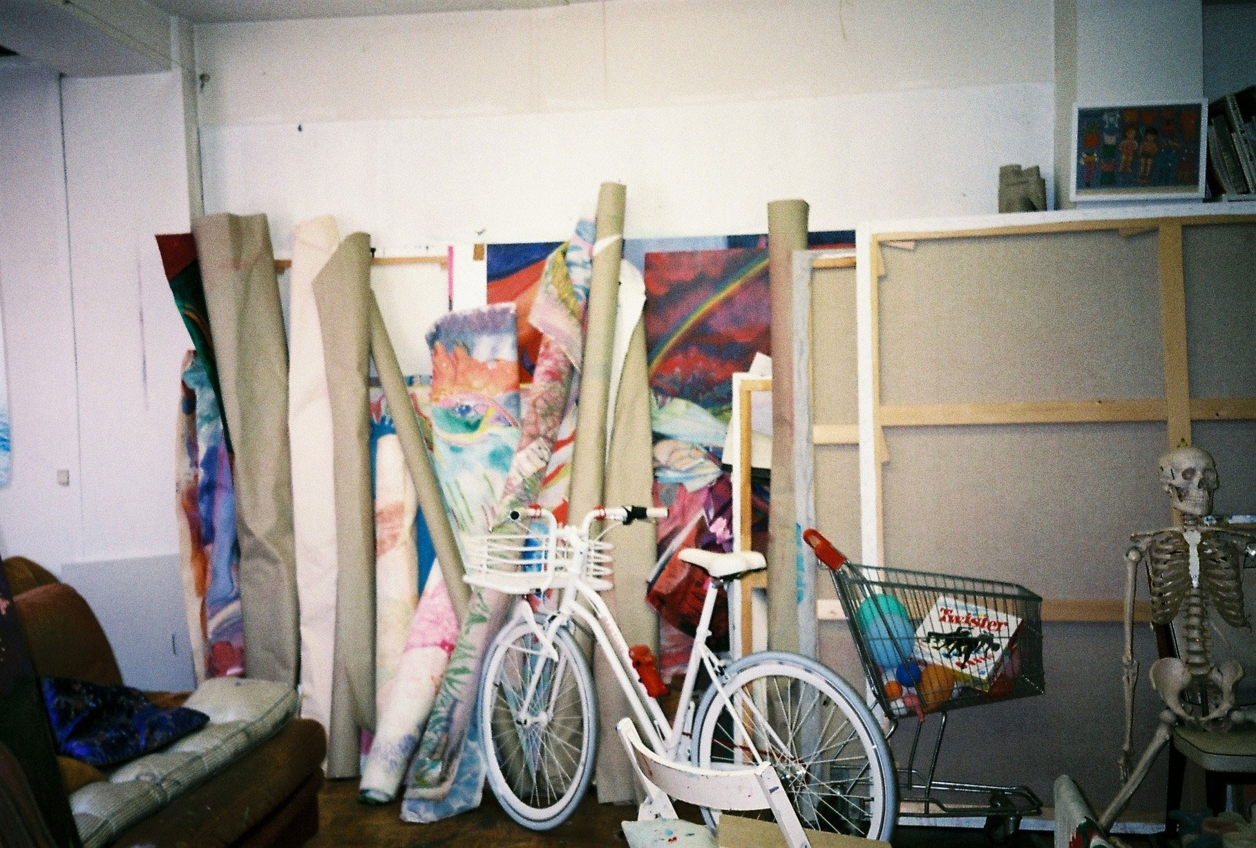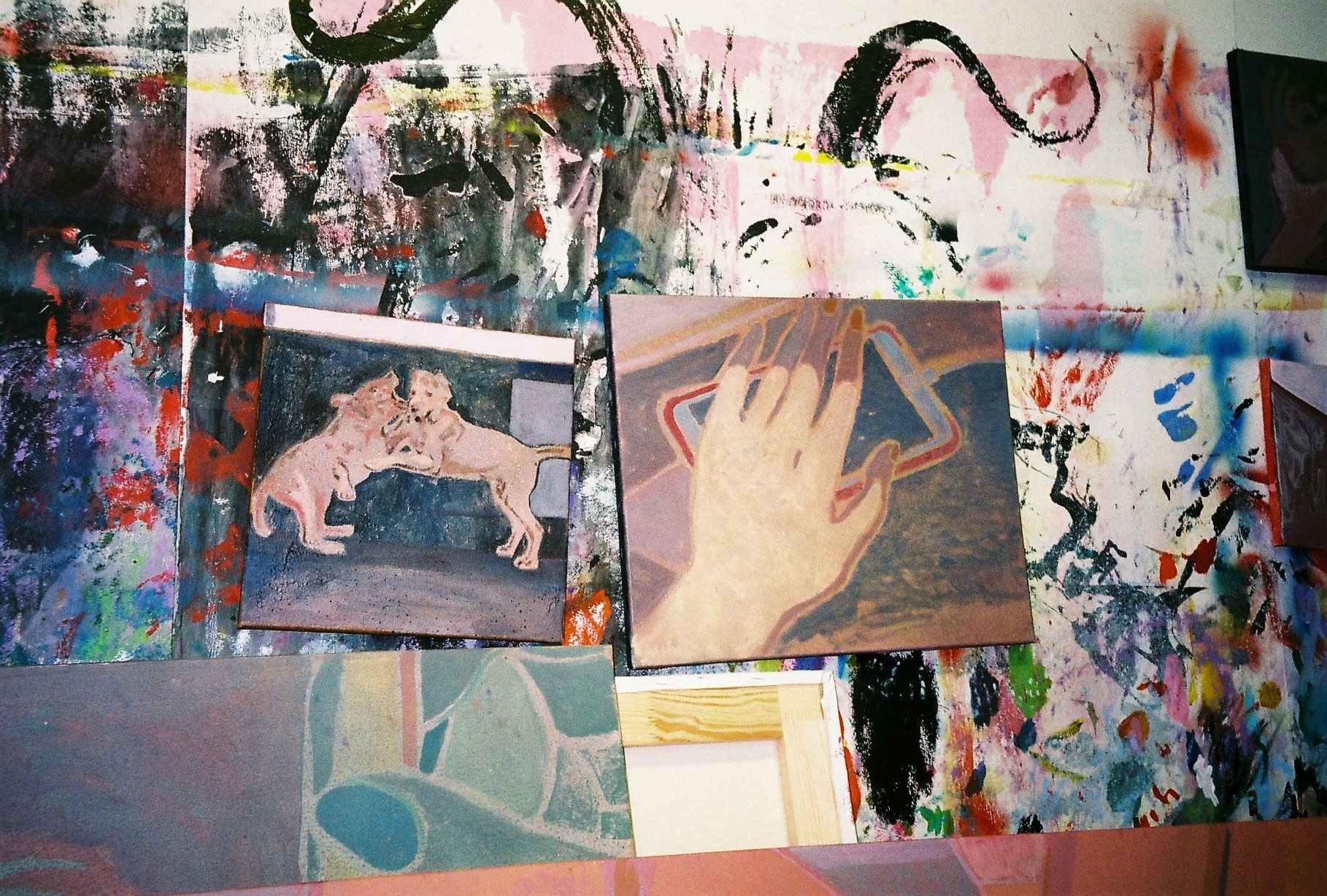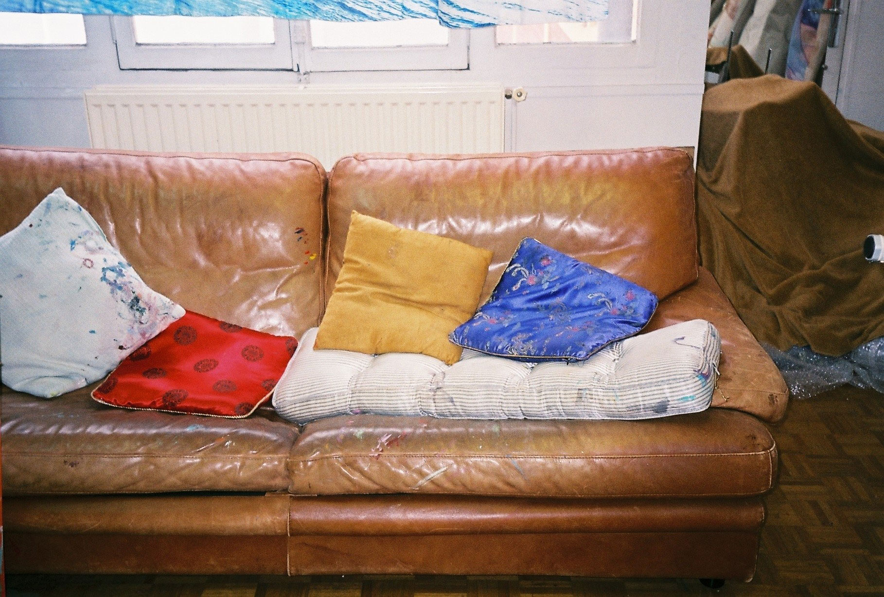 Inside artist Marcella Barceló’s Paris apartment lives a parallel world of colorful creatures that seem to come straight from a terrorific dream: a cigarette smoking spider, an abnormally large crow and an intimidating jellyfish. Despite their daunting appearance and native outdoor habitats, the painted characters don’t often have external exposure. Like some torpid creature that hibernates in caves, Marcella often spends weeks without going out of her live-work studio, where her work is produced in an atmosphere of darkness and isolation. The artist obstructs any natural light that enters the domestic space with pitch black curtains, enabling her to work for days through artificial glares. In addition, this dim setting enhances the painting’s supernatural colour palette exposing its viewers to a tantalizing adventure alongside kitsch references and surreal depictions made up of bright purple volcanoes and electric pink cocktail drinks. Through figurative representations of daily life moments, including a citrus being stripped with bare hands and an adolescent gently fitting in her socks, the artist captures very intimate, erotic bodily gestures. With the exception of her twister party friends that probably gather there in order to sneak-peek at the unusual beings, she is pretty much these characters’ sole company. Sensing a tender but tense mood, anticipated by the spilled paint, scattered books, beheaded dolls and running tap water as spotted in one of her canvases, her studio gives an enigmatic impression, whilst spellbind she performs a macabre birthing scene, materialized through painting.