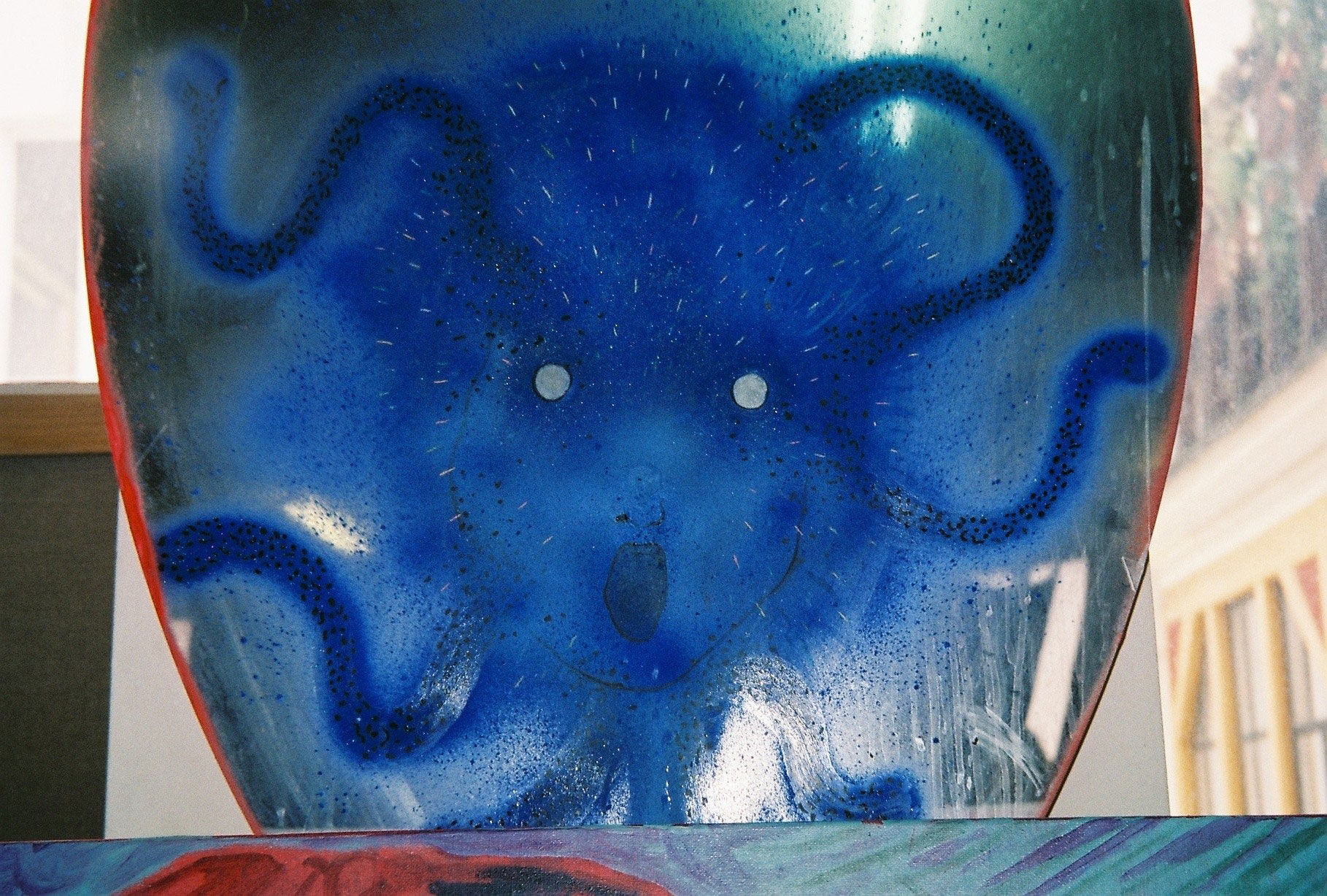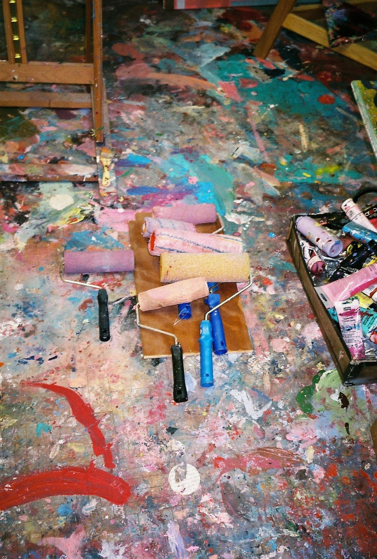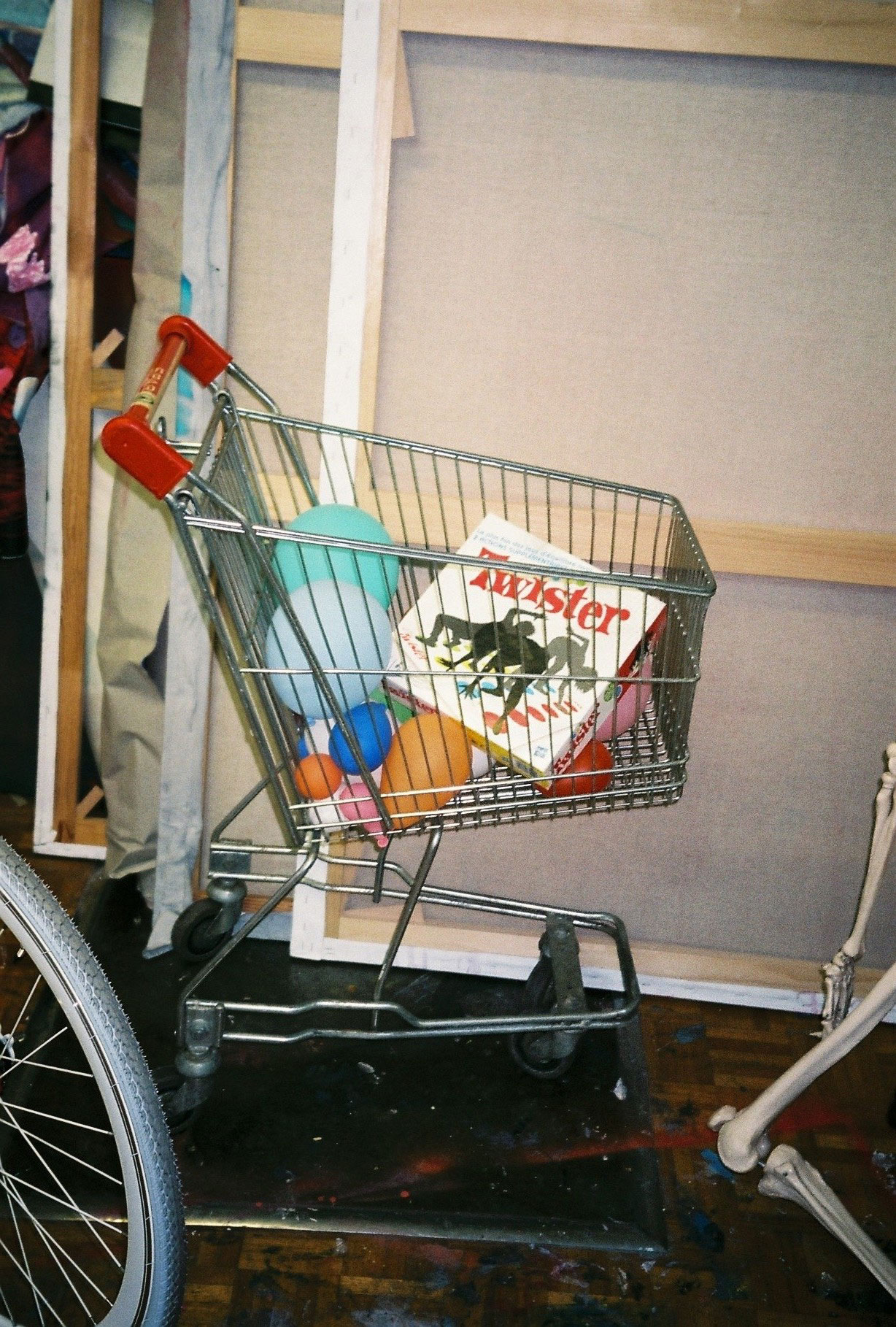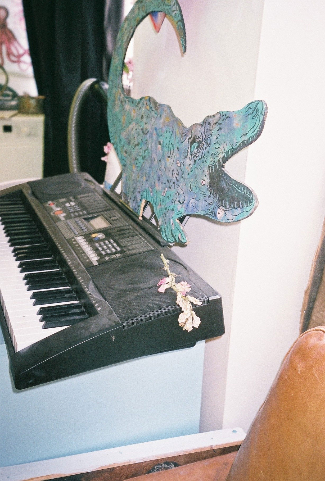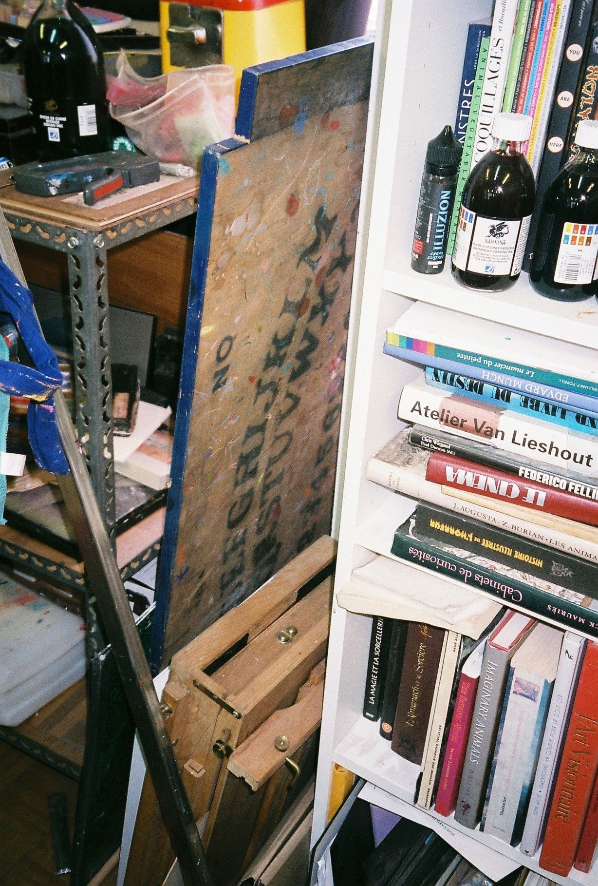 Inside artist Marcella Barceló’s Paris apartment lives a parallel world of colorful creatures that seem to come straight from a terrorific dream: a cigarette smoking spider, an abnormally large crow and an intimidating jellyfish. Despite their daunting appearance and native outdoor habitats, the painted characters don’t often have external exposure. Like some torpid creature that hibernates in caves, Marcella often spends weeks without going out of her live-work studio, where her work is produced in an atmosphere of darkness and isolation. The artist obstructs any natural light that enters the domestic space with pitch black curtains, enabling her to work for days through artificial glares. In addition, this dim setting enhances the painting’s supernatural colour palette exposing its viewers to a tantalizing adventure alongside kitsch references and surreal depictions made up of bright purple volcanoes and electric pink cocktail drinks. Through figurative representations of daily life moments, including a citrus being stripped with bare hands and an adolescent gently fitting in her socks, the artist captures very intimate, erotic bodily gestures. With the exception of her twister party friends that probably gather there in order to sneak-peek at the unusual beings, she is pretty much these characters’ sole company. Sensing a tender but tense mood, anticipated by the spilled paint, scattered books, beheaded dolls and running tap water as spotted in one of her canvases, her studio gives an enigmatic impression, whilst spellbind she performs a macabre birthing scene, materialized through painting.